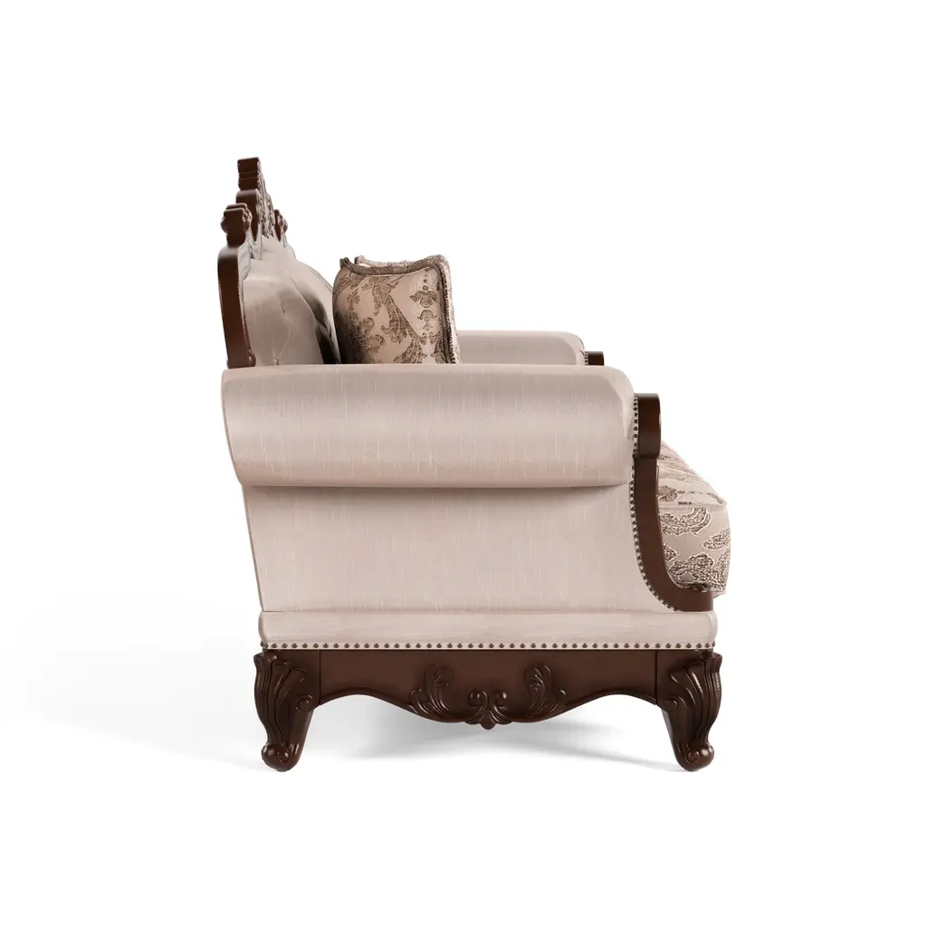 Step into a realm of classic luxury with this 2-seater loveseat, featuring sumptuous fabrics and ornate wood detailing. Its timeless tufted back and plush seating provide an elegant yet comfortable retreat for your cherished moments at home. Features: Includes one (1) traditional 2-seater loveseat Available in two (2) colors options: dark cherry and light brown, dark cherry and beige Materials: fabric, solid wood Classic traditional style creates an air of sophistication Durable fabric and solid wood construction ensure longevity Features a button tufted back with crystalline buttons for a refined look Baroque-inspired faux wood detailing on arms and base for an artisan touch Rolled arms provide both beauty and comfort Cabriole legs offer a stately foundation with timeless appeal Box seat cushion with welt cord accentuates the chair's structure Adorned with nailhead trim for a classic decorative touch Includes an accent pillow with tassel adornments and a patterned fabric center Floral seat pattern fabric reveals an attention to intricate design detail Ideal for formal living spaces or as a bold bedroom statement piece Assembly made simple with included clear instructions Dimensions: Overall: 45 inches high x 70 inches wide x 38 inches deep Seat: 19 inches high x 54.63 inches wide x 25.5 inches deep Seat width arm to arm: 49.5 inches Weight capacity: 500 pounds Weight: 62 pounds Whether you are a deal seeker, trendsetter or just window shopping, Furniture of America® is there for your every need. You'll find that we offer every style, from rustic farmhouse and urban industrial to French antique, mid-century modern, and glamorous chic; we welcome you to explore our ample style possibilities to find the perfect pairing for your personality. Furniture of America® is proud to be the family friend that always has your back. Product Care: For daily cleaning, simply use a vacuum cleaner to gently remove dust and debris from the surface For minor stains, wipe with a slightly damp cloth. Do not use chemical cleansers, abrasive cleaners or furniture polishThis product will ship to you in one (1) box.