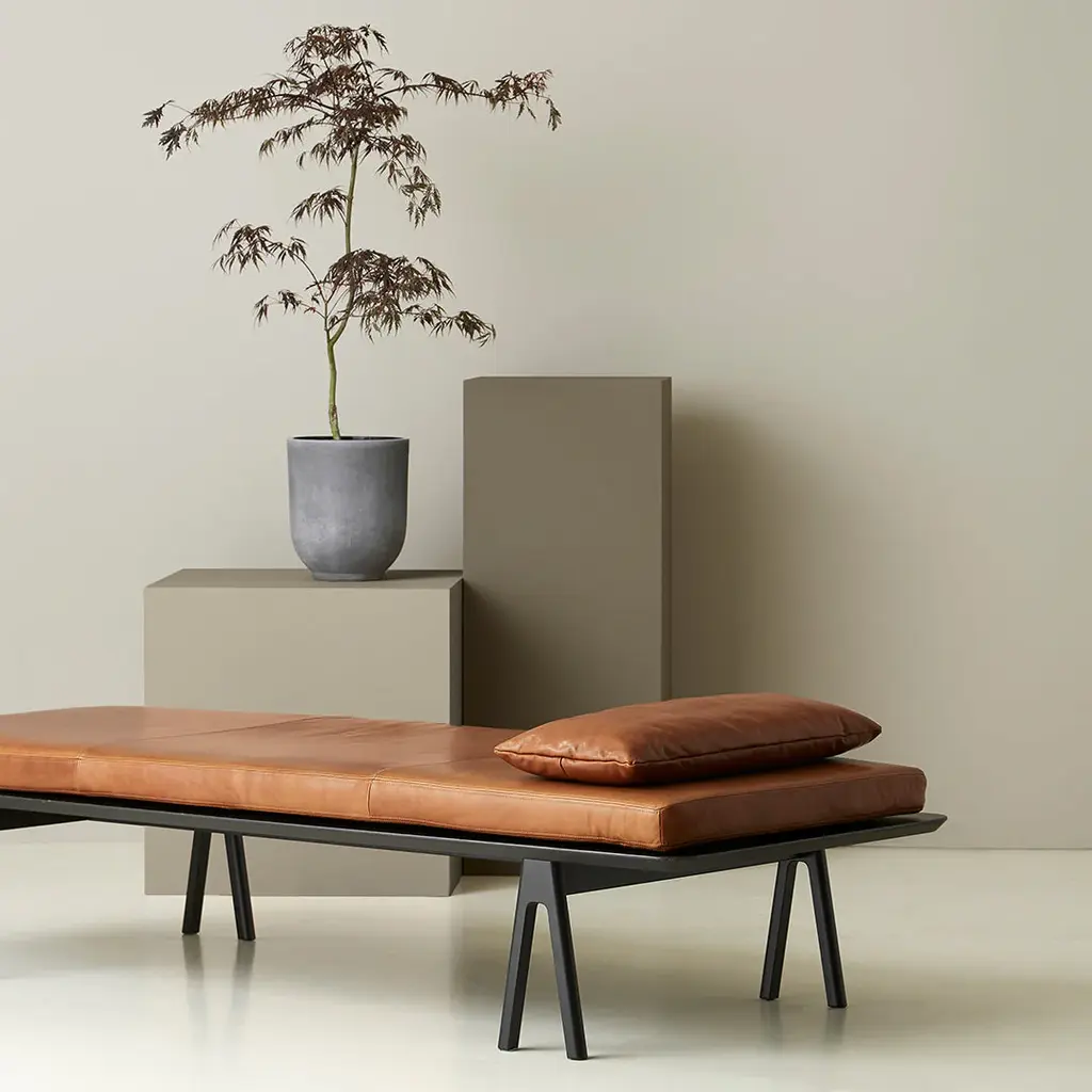 A matching pillow for the Level Daybed.The Level daybed uses the iconic form of sawhorses in the simplest arrangement possible: A sheet laid across a pair toppen with a rectilinear mattress. The supple leather and the sturdy wood components elevate the simple whole. The daybed takes its name, Level, from a symmetry between the domestic and work environment; a generally sought-after condition.