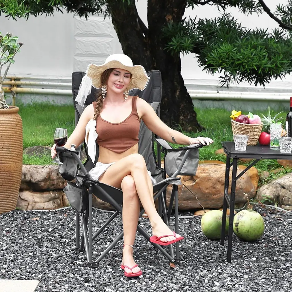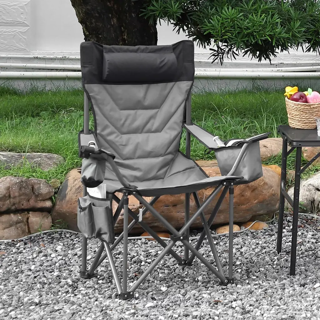 "Oversized Camping Chair - Heavy Duty 500Lb Capacity Folding Chair with High Back & Pillow, Includes Cooler Bag & Cup Holder (Grey)"Product Overview:The TROPOW Oversized Camping Chair redefines outdoor comfort with its industrial-strength 500lb capacity and premium padded design. Measuring 22"D x 35"W x 43"H, this alloy steel-framed chair features 600D Oxford fabric, ergonomic high-back support, and multiple storage accessories ¨C perfect for camping, beach trips, or backyard relaxation.Key Features & Specifications:Commercial-Grade Durability500lb weight capacity (reinforced alloy steel frame)Double-layer 600D Oxford fabric (tear/UV-resistant)Scratch-resistant powder coating for all-weather useLuxury Comfort FeaturesHigh-back design + thick headrest pillow2" full-seat cushioning (breathable mesh panels)Wide 35" seat for spacious seatingSmart Outdoor ConvenienceSide mesh pockets + detachable 6-can cooler bagBuilt-in cup holder & stainless steel bottle openerWine glass loop for secure drink storagePortable Heavy-Duty DesignFolds to 43" x 5.3" (fits most car trunks)Only 12.5 lbs with anti-slip rubber feetTool-free setup (ready in 10 seconds)All-Terrain VersatilityStable on sand/grass/gravel (4-point base)Easy-wipe fabric (stain/moisture-resistant)Ideal for camping, tailgating, or festivals