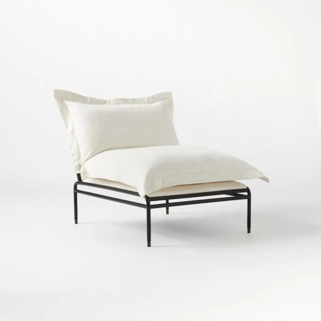 "My favorite, favorite, favorite piece in this collection. It's so good," gushes Kara Mann of this luxurious lounge chair. Plush, oversized cushion casually hangs over an iron rod frame with a lustrous black finish. Bronze cap feet add a finishing touch to this covetable seat. CB2 exclusive.