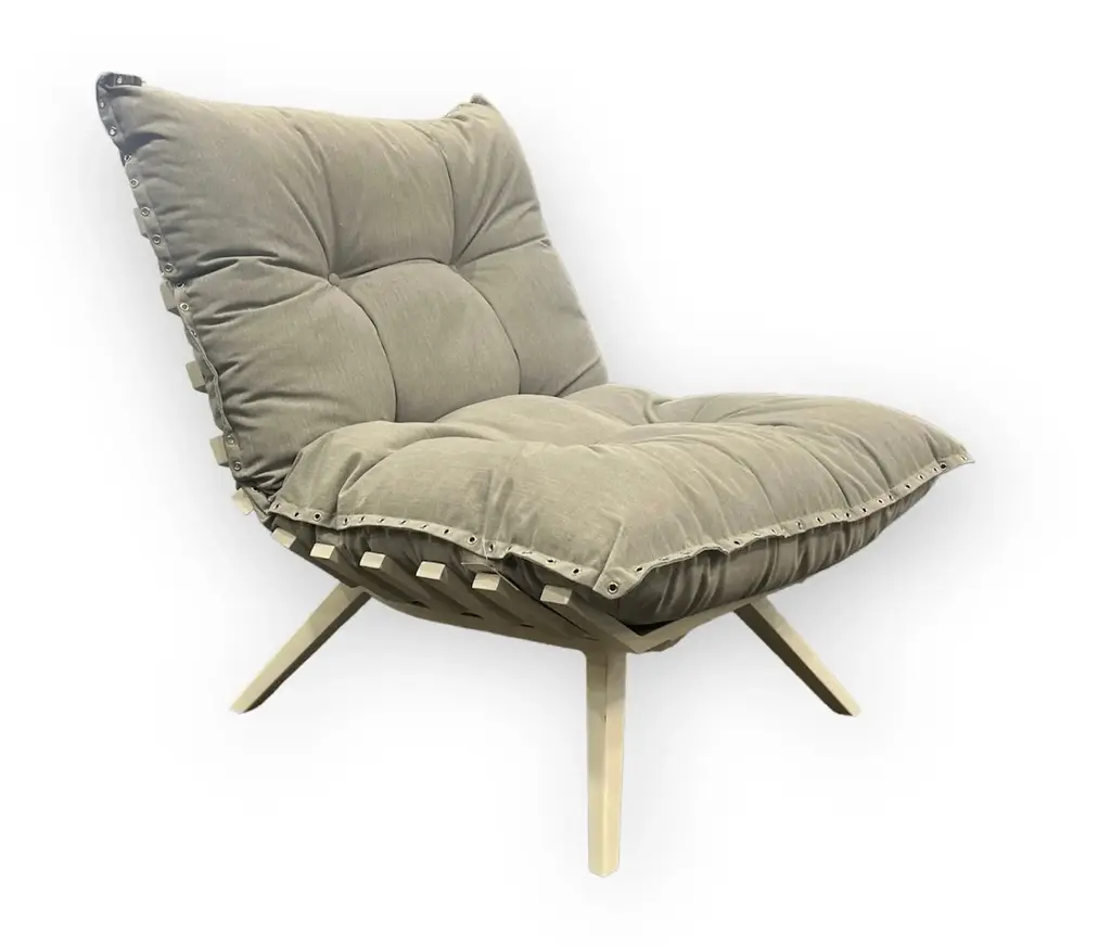Indulge in ultimate comfort and style with the Solid Wood Armchair by Mogg. Crafted from solid beech wood, this chair features a unique open structure that beautifully showcases its artisanal craftsmanship. Complete with 7 plush feather pillows, available in a variety of colors, and a playful contrast of cushions fixed with straps, this chair is the epitome of elegance and simplicity.