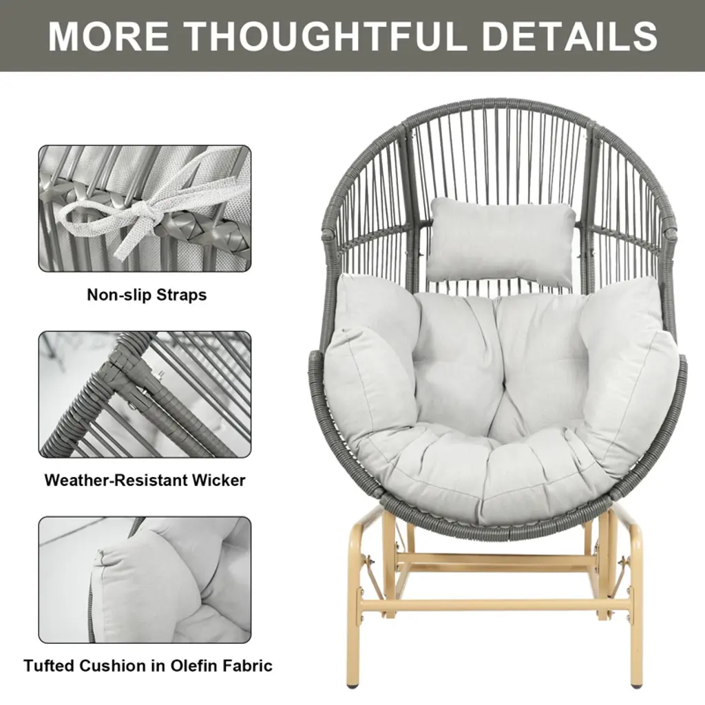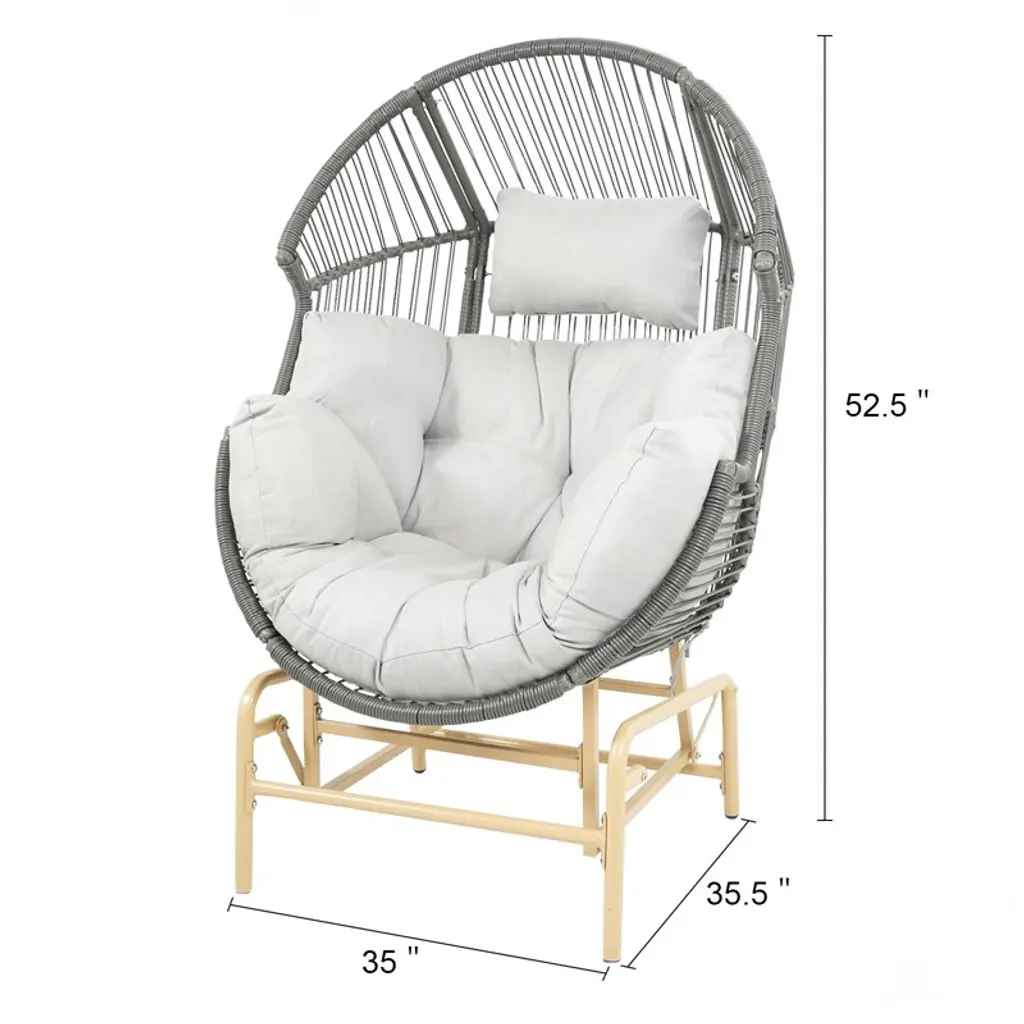 Elevate your outdoor oasis with our Glider Wicker Egg Chair, blending plush comfort and effortless style in one stunning package - The perfect blend of comfort and style for your outdoor space. Featuring a smooth gliding motion, weather-resistant wicker construction, and a plush included cushion, this chair offers effortless relaxation. Its durable design ensures lasting enjoyment, making it ideal for lazy afternoons or quiet evenings in your garden or patio.