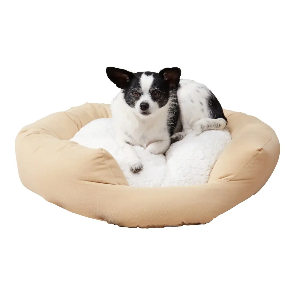 The Happy Hounds Scout Dog Bed is a round, pillow style bed featuring durable, box-style edges finished with a contrast decorative cording. Its heavy-duty microfiber fabric cover is removable and machine washable making it easy to keep your furry friend's bed clean and fresh. The bed is completely reversible, and features a hidden zipper closure. This bed is generously filled with a 100% post-consumer recycled poly-fiber fill. Fabric shell is made in China, bed is filled and finished in the USA. Bed dimensions can be +/- 2 inches. Please note product will arrive in a slightly compressed state; please allow a few days for product to expand to final size listed in description.Heavy-duty microfiber fabric is water and stain-resistantRemovable cover is machine washableReversible designRound design ideal for dogs who like to curl up while sleeping