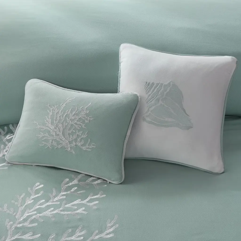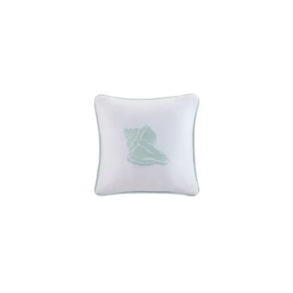 SEVOBAL square decorative pillow from Harbor House's Coastline collection brings understated coastal elegance to any space. The ivory cotton jacquard fabric showcases a beautifully embroidered aqua conch shell at the center, framed by sophisticated aqua piping. The pillow's refined craftsmanship and nautical detailing make it equally at home in beach cottages or urban interiors seeking a touch of seaside charm. The plush hypoallergenic fill provides just the right amount of support.