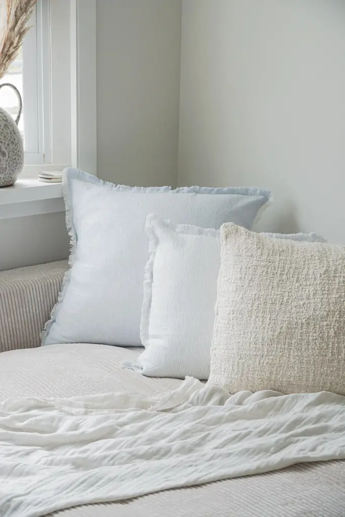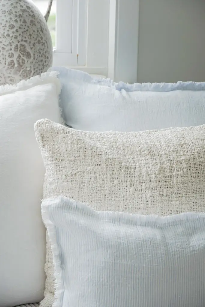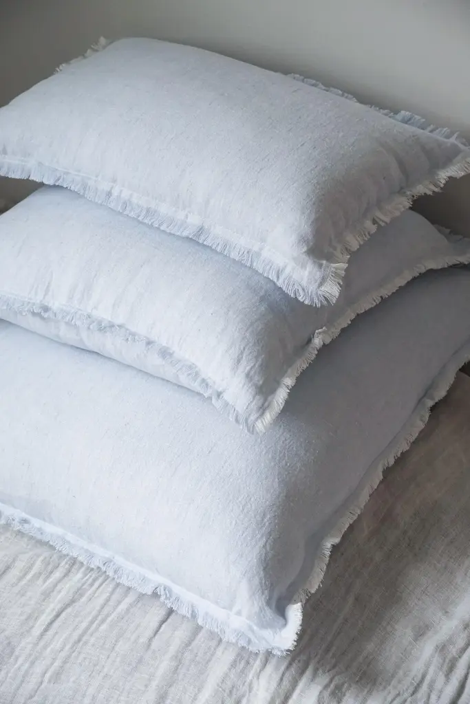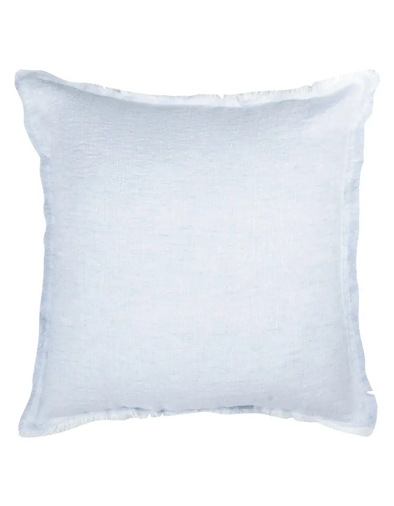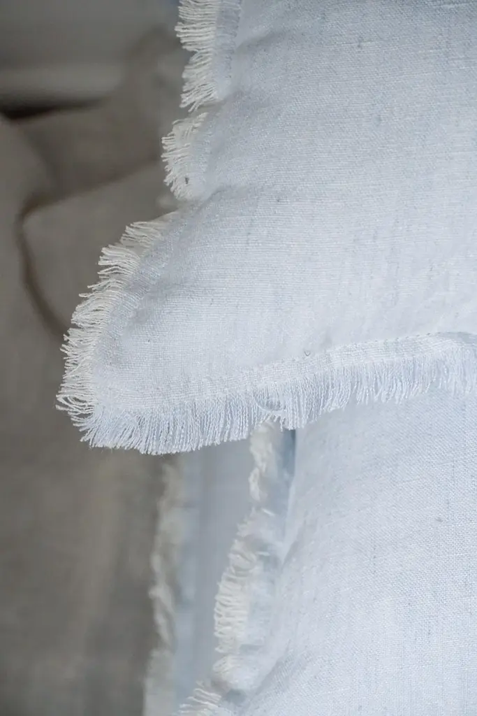 Our Sky Blue Crossdye So Soft Linen Pillow is Soo soft- you won’t believe it's linen! This yarn has a slight nub which gives it a beautiful natural texture. Edges have a self-fringe on all sides. Details Front & Back Color: Sky Blue (Sky Blue & White yarns Cross dyed) Front & Back side: 100% Linen (Pre-washed) Concealed zipper closure on back side. Hand washing or a delicate cycle with like colored fabrics recommended. Hang to Dry. Made in India Down Alternative Insert Benefits: Allergen free, Better back support, Retain their shape Inside Fill: 1.2 denier x1.25" polyester gel Outer Shell: 65% polyester/ 35% white cotton blend Made in the USA