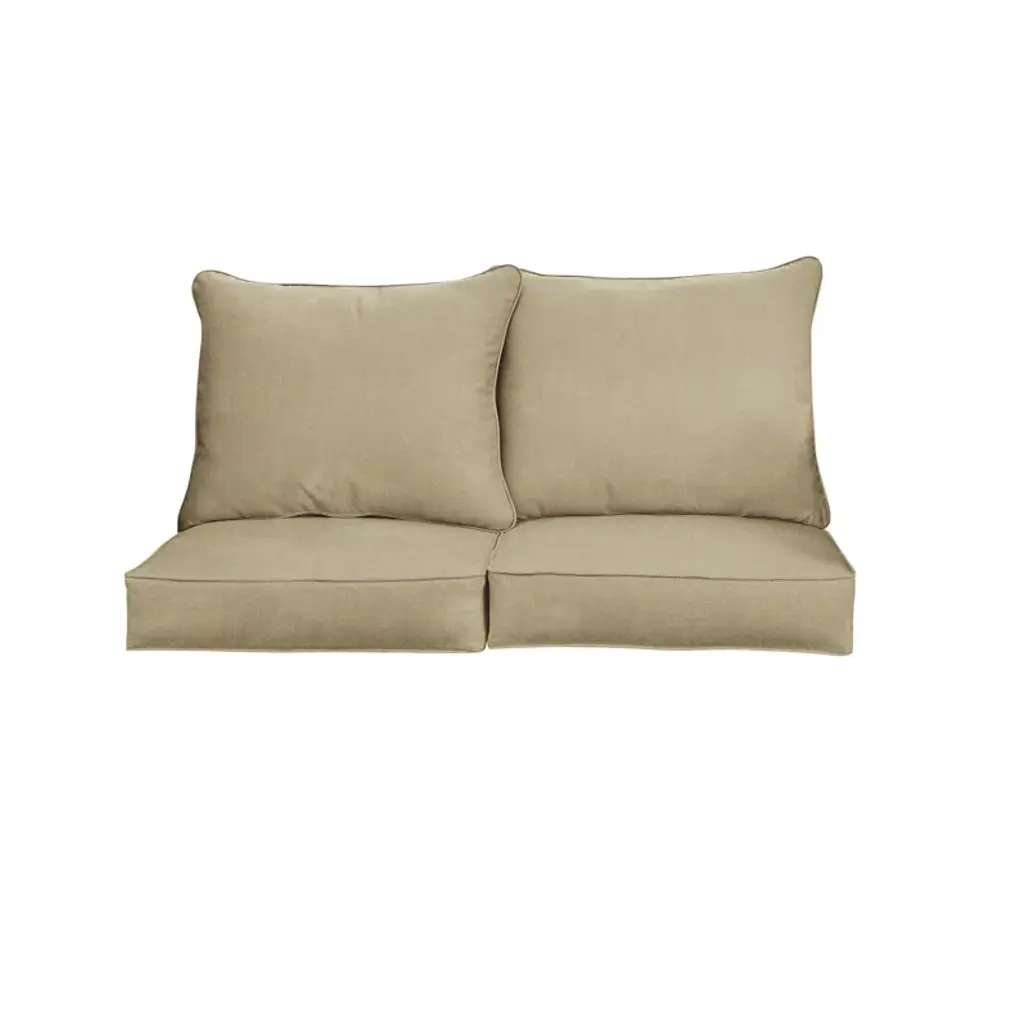 The elegant tone of this Sunbrella canvas beige indoor-outdoor deep seating sofa pillow and cushion set from Mozaic is a gorgeously subtle way to enhance the look of any outdoor seating. You'll appreciate the corded weather-, fade-, and UV-resistant fabric for how it handles the elements. You'll love how the beige tone is the perfect match for nearly any casual or outdoor decor.Overall Sofa Width: 69 inchesOverall Sofa Depth: 25 inchesBack Pillow Width: 27 inchesBack Pillow Height: 22 inchesSeat Cushion Width: 23 inchesSeat Cushion Depth: 25 inchesSeat Cushion Height: 5 inchesInner Pillow Width: 25 inchesInner Pillow Height: 20 inches
