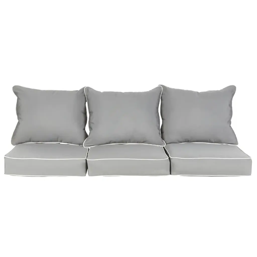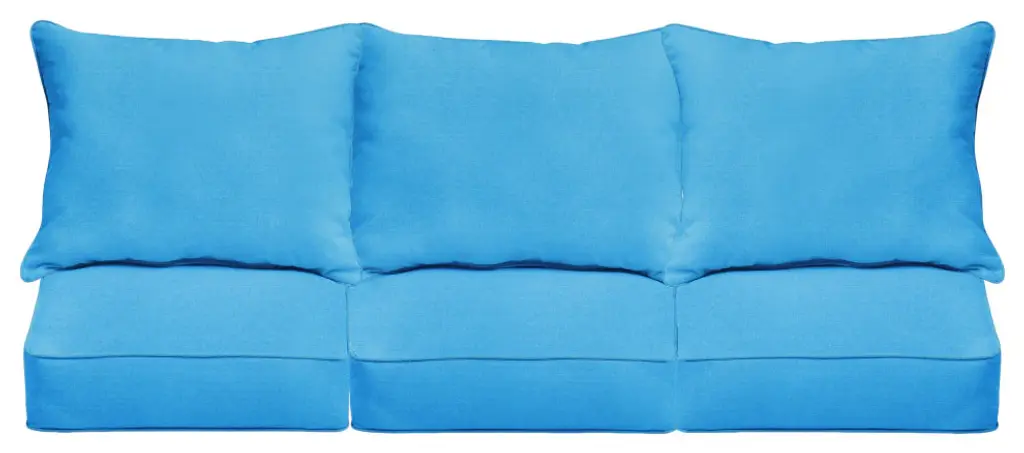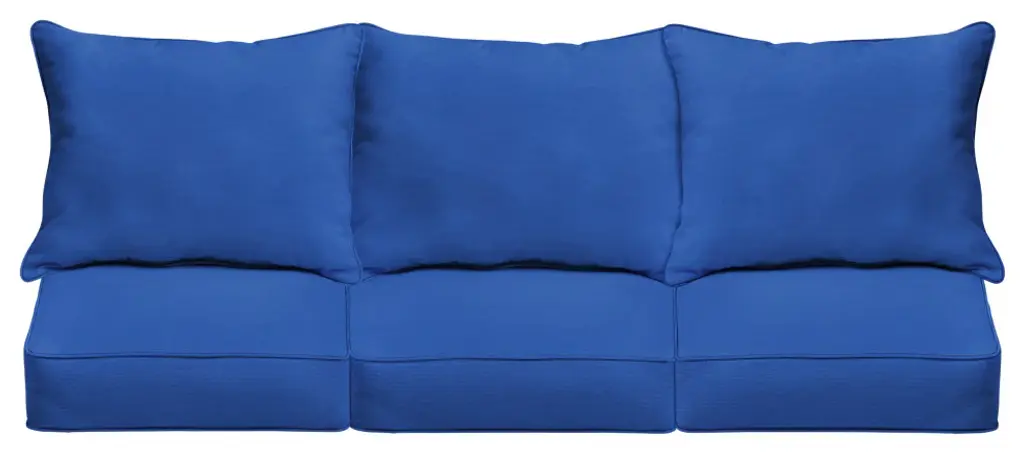 Enjoy style and comfort on this Sunbrella navy blue with ivory indoor-outdoor deep seating sofa pillow and cushion set from Mozaic. The corded weather-, fade-, and UV-resistant fabric upholstery stands up to nearly any type of punishment. The contrast piping makes this set as stylish as it is durable, and you'll enjoy it for years to come in any seating arrangement.Overall Sofa Width: 69 inchesOverall Sofa Depth: 25 inchesBack Pillow Width: 27 inchesBack Pillow Height: 22 inchesSeat Cushion Width: 23 inchesSeat Cushion Depth: 25 inchesSeat Cushion Height: 5 inchesInner Pillow Width: 25 inchesInner Pillow Height: 20 inches