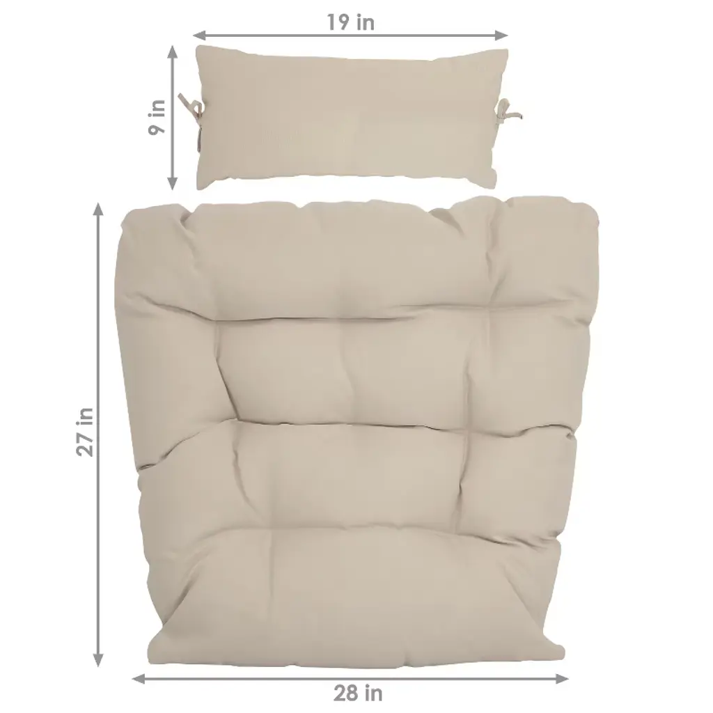 Replace worn out cushions or simply opt for a change of scenery with these replacement cushions. This product includes 1 replacement seat cushion and 1 replacement headrest pillow that instantly gives any hanging chair a style refresh. The durable materials can easily withstand the outdoor elements. Also, setting these cushions up is easy. The headrest pillow and seat cushion feature fabric ties to secure them to an egg chair frame (please note, an egg chair frame not included and must be purchased separately). Available in multiple colors, this solid color set will easily complement any modern, contemporary, natural, or colorful outdoor or indoor aesthetic. Sit back, relax, and lounge in style on these comfortable, neutral-toned cushions.• SOFT AND PLUSH: Seat cushion is 28 inches wide x 27 inches deep x 4 inches thick; Headrest pillow is 19 inches wide x 9 inches deep x 4 inches thick; 8 pounds• STRONG AND EASY TO MAINTAIN: The cushions are made of polyester fabric with a polyurethane fiber fill. The materials can withstand the outdoor elements.• COMPLETE SET OF CUSHIONS: This set includes 1 seat cushion and 1 headrest pillow.• SIMPLE TO SET UP: The headrest pillow and seat cushion feature fabric ties to easily secure each cushion to the egg chair frame (egg chair not included and must be purchased separately).• WORRY-FREE PURCHASING: Sunnydaze Decor backs its products with a 1-year manufacturer's warranty.
