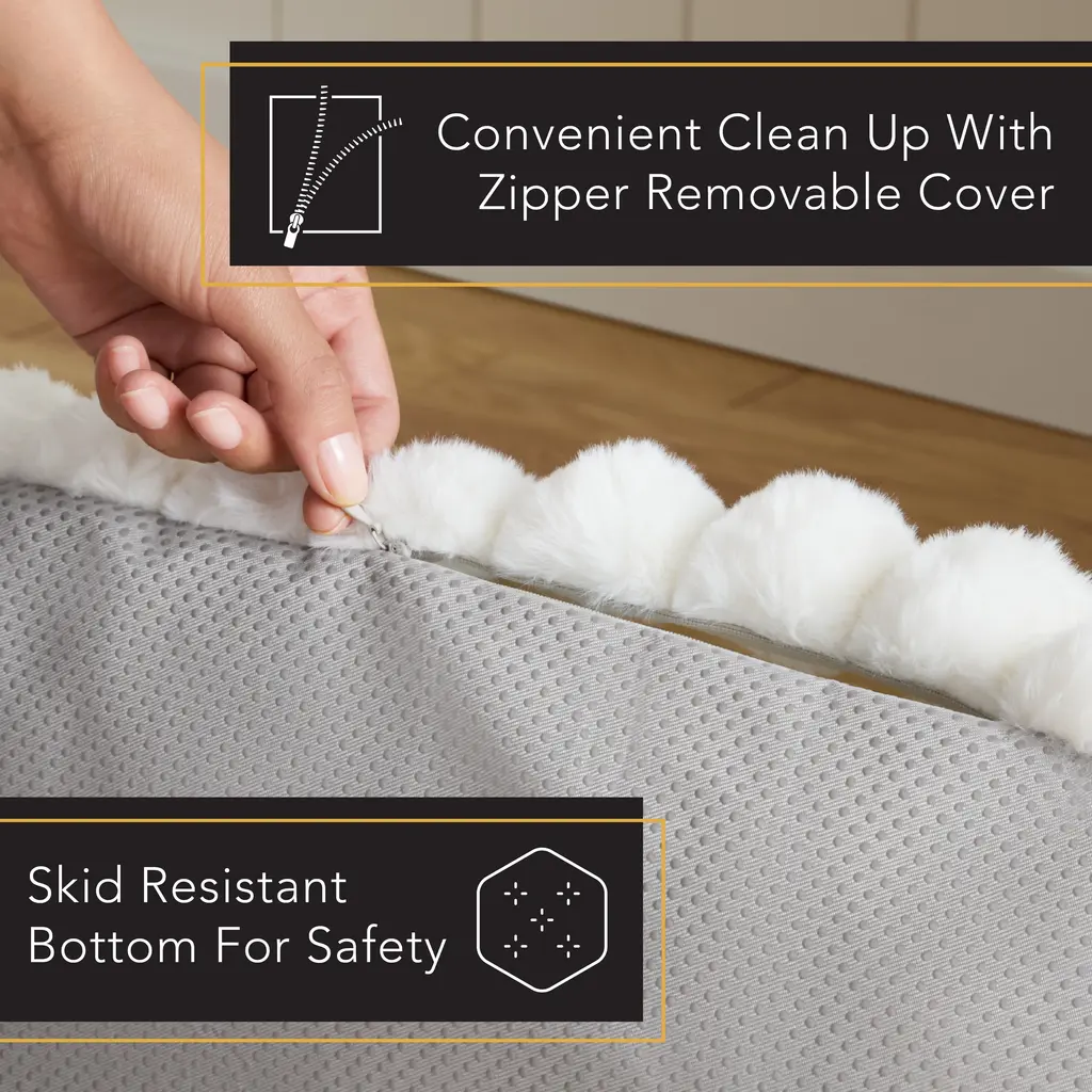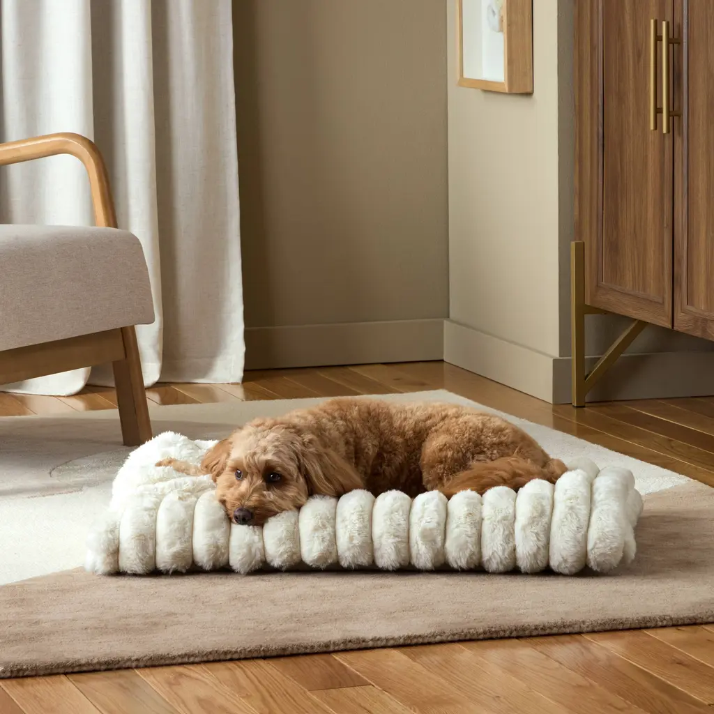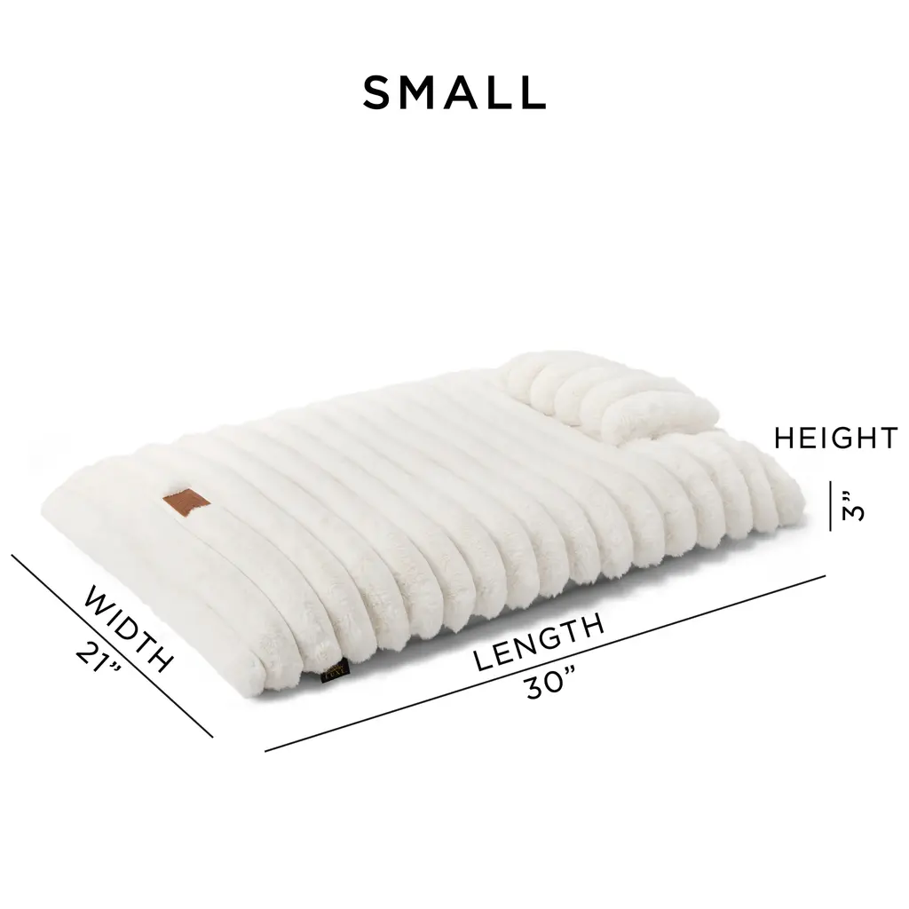 Spoil your pet with the Town & Country Luxe CuddleTown Ribbed Bubble Stripe Pillow Crate Mat Pet Bed, meticulously designed for supreme comfort and relaxation. Featuring an ultra-soft faux fur top and an attached mini pillow for extra comfort and neck support, this bed is wrapped in velvety ribbed texture with a plush, cushioned interior—creating a tranquil haven for your furry companion. The removable, machine-washable cover offers effortless care and includes water-repellent protection for long-lasting use. A skid-resistant bottom ensures the bed stays securely in place, providing a stable and safe surface for your pet. Ideal for pets of all sizes, this chic and functional floor pillow bed is an essential addition for any pet owner with an eye for style. Standard 100 by Oeko-Tex Certified.