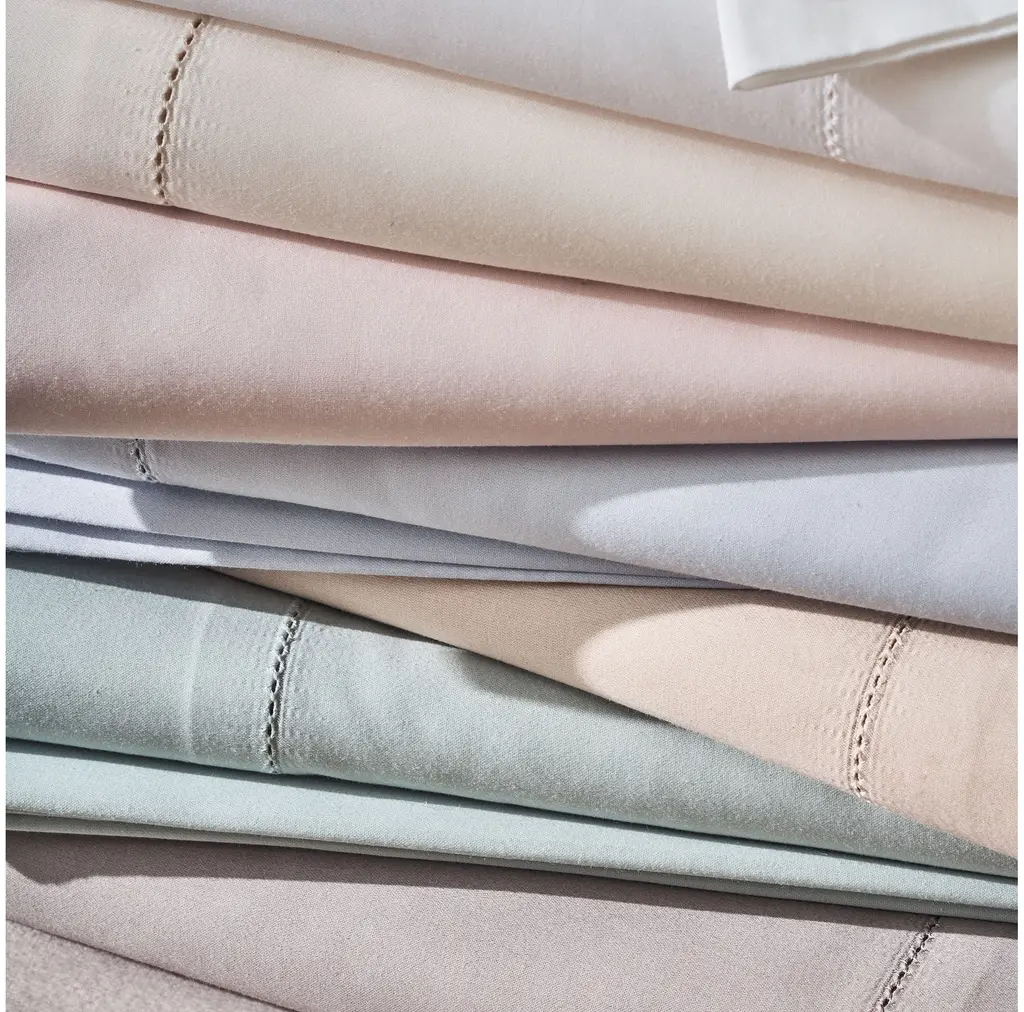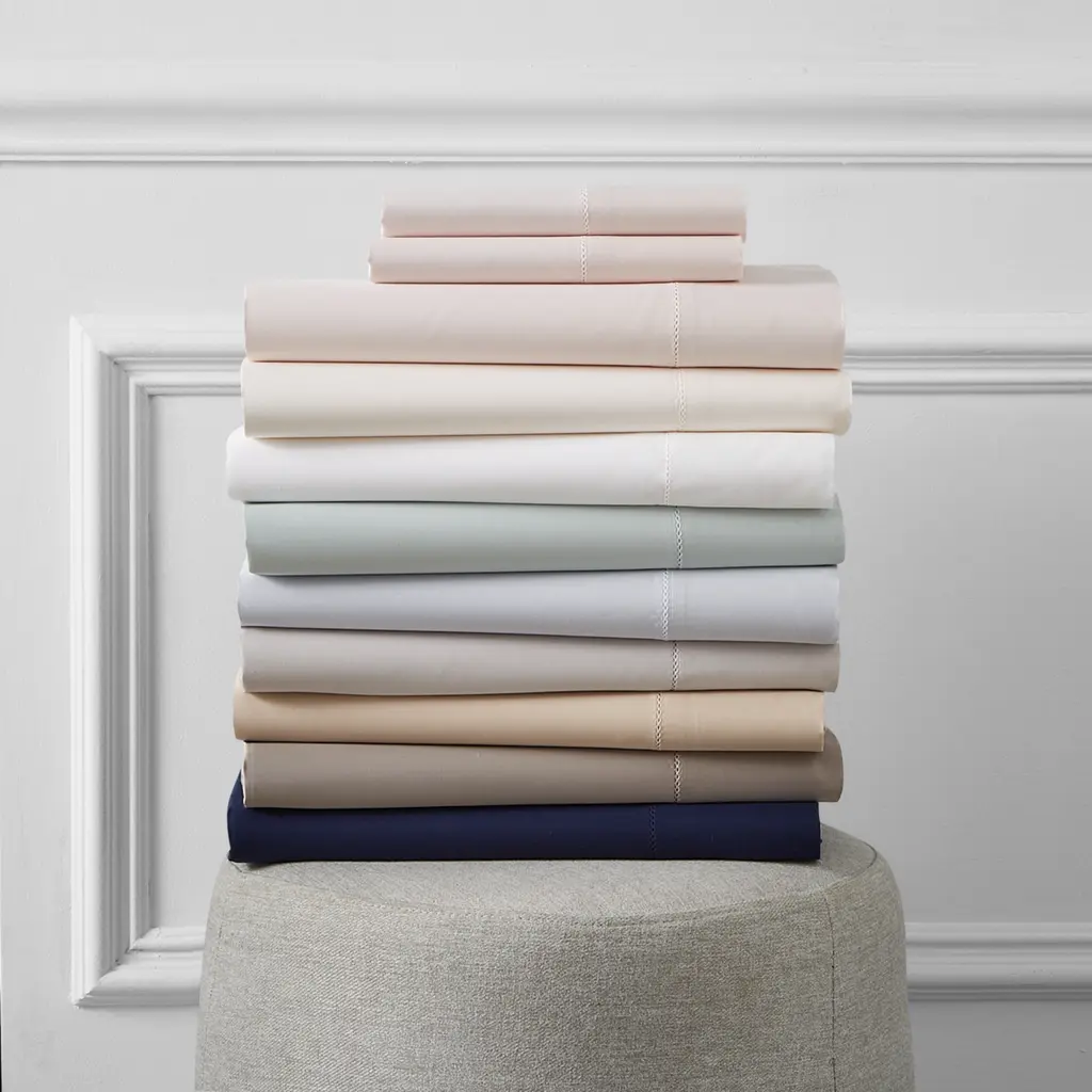 Smooth and sumptuous, Hudson Park Collection's 680-thread count Supima sateen sheets boast a single hemstitch detail at the cuff of the flat sheet and pillowcases, all in a soft, neutral color palette.