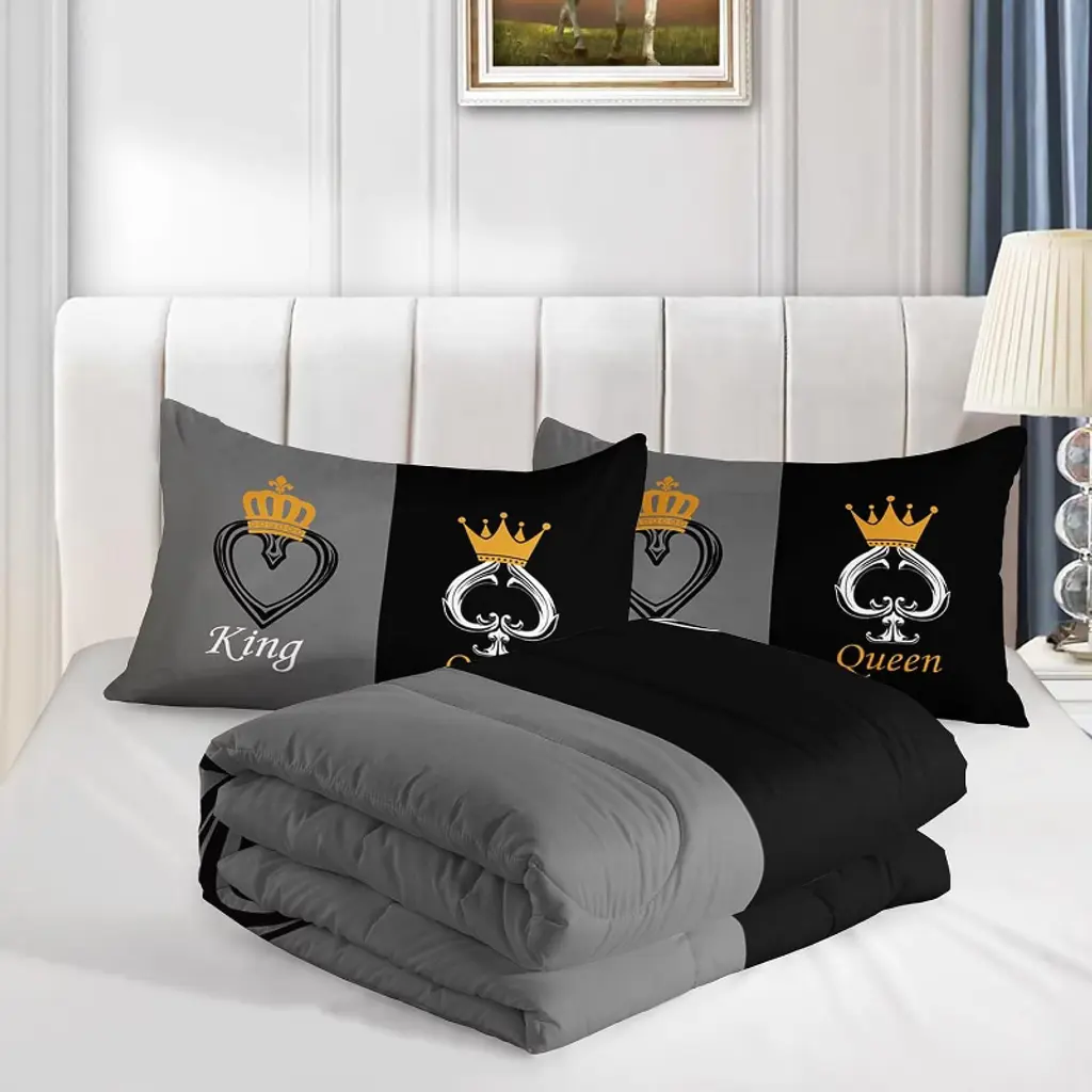 Black And Gray Crown Bedding, Wedding Anniversary Valentine's Day Gift, Heart-shaped Quilt With 2 Pillowcases, Three-piece Set, King