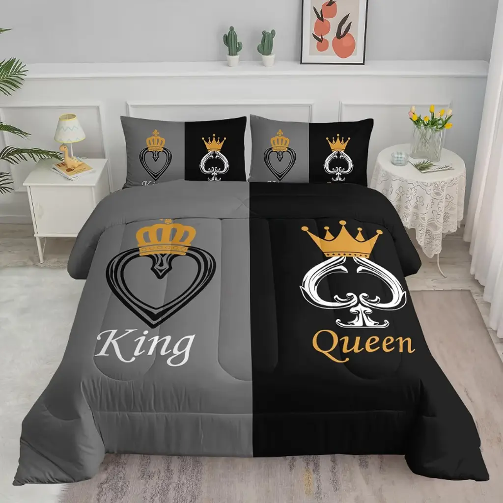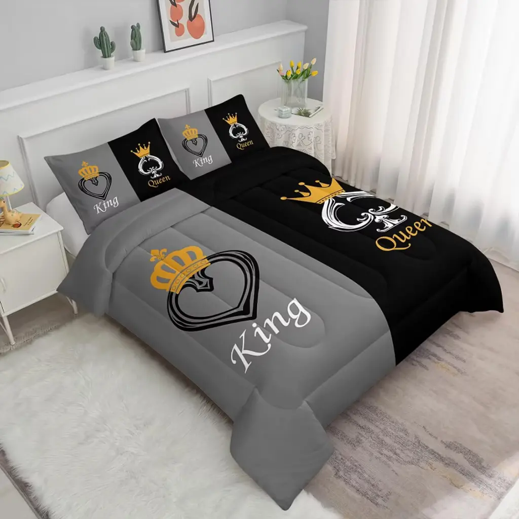 The black and gray crown-themed three-piece bedding set is a romantic gift for wedding anniversaries and Valentine's Day. The set includes a heart-shaped comforter and two pillowcases, featuring a classic black and gray color scheme with elegant crown elements, creating a simple yet warm and cozy bedroom atmosphere. The heart-shaped quilt boasts a distinctive design, symbolizing two hearts tightly intertwined. The crown patterns scattered throughout not only highlight the cherishment and respect for one another but also convey deep affection. The black and gray color scheme is steady and textured, seamlessly blending into any bedroom style, whether modern minimalist or luxurious vintage. The fabric is soft and comfortable against the skin, ensuring a restful night's sleep and making every evening a continuation of love. Whether it's revisiting sweet memories on an anniversary or surprising your partner on Valentine's Day, this bedding set, with its unique design and heartfelt intention, will witness the happy moments of your relationship.