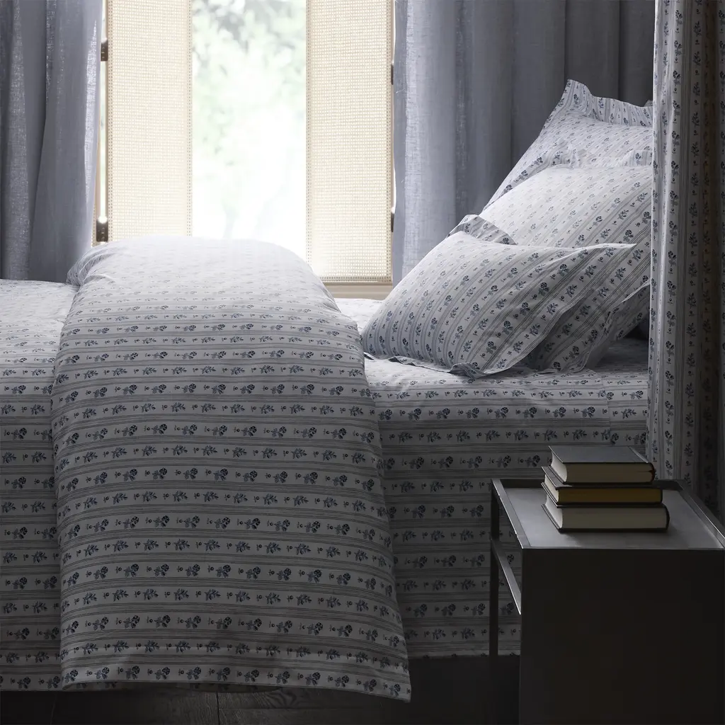 Cabanon Stripe is a Matouk Schumacher print with delicate stripes and small-scale florals that evoke a French Provincial sensibility. Crafted on crisp percale, its clean finish and refined detailing bring an airy elegance to any bed design.