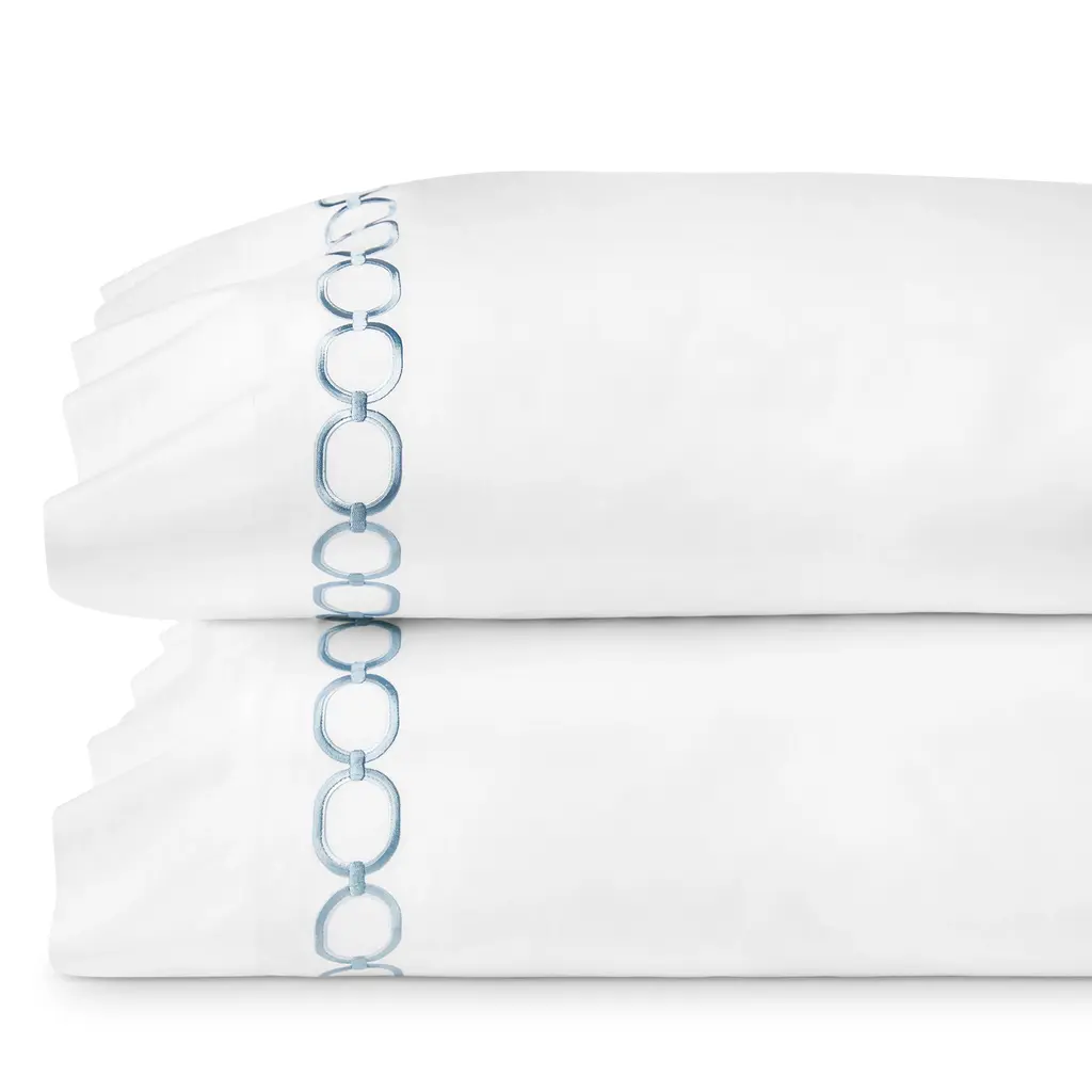 Sleek and modern, the Catena Collection from SFERRA displayes a minimalist chain motif inspired by the timelessness of fine jewelry. Framing a canvas of pristine white percale crafted from long-staple cotton, the design is embroidered with immaculate precision in a white and sand colorway. Two-tone embroidery creates a sense of depth.