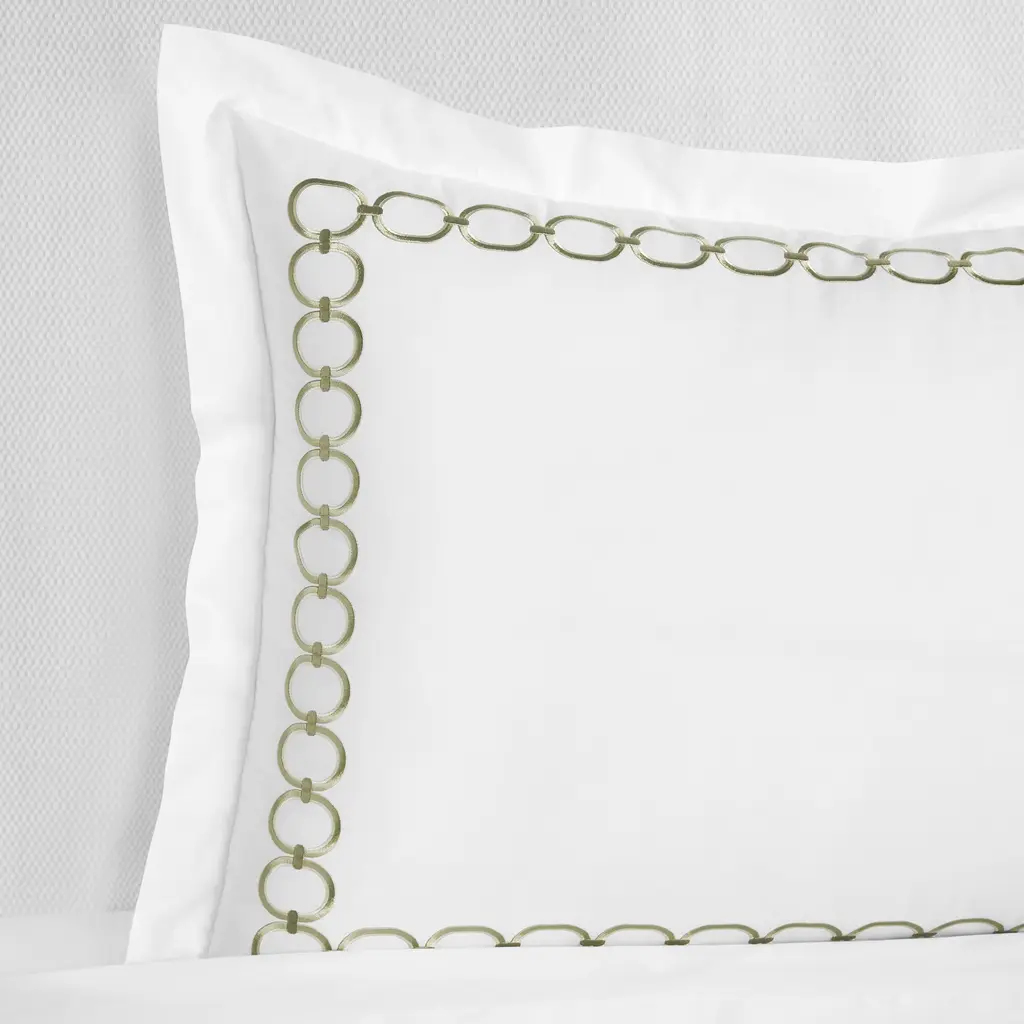 Sleek and modern, the Catena Collection from SFERRA displayes a minimalist chain motif inspired by the timelessness of fine jewelry. Framing a canvas of pristine white percale crafted from long-staple cotton, the design is embroidered with immaculate precision in a white and sand colorway. Two-tone embroidery creates a sense of depth.