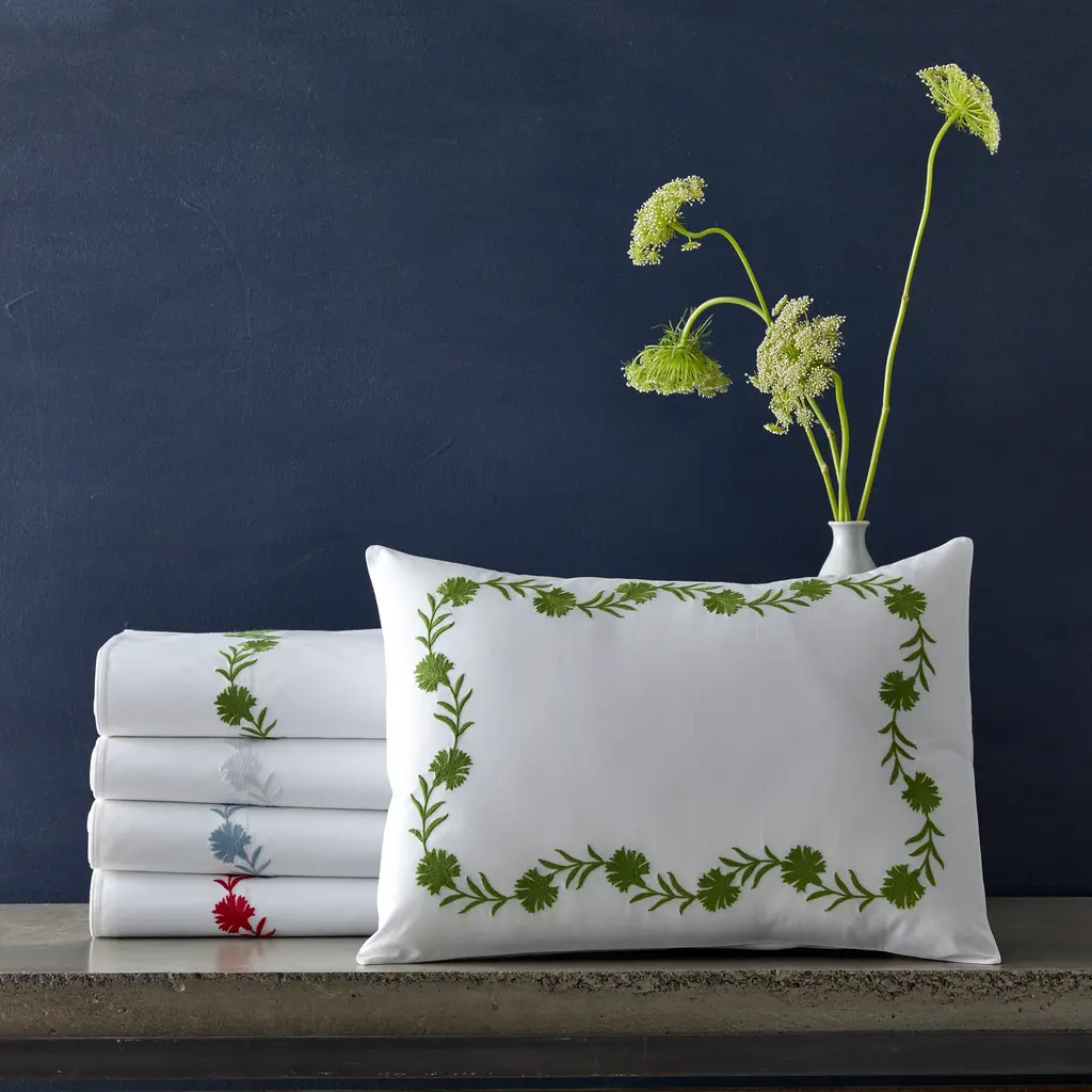 Daphne's embroidered floral vine is a beautifully crafted detail that, depending on your choice of thread color, can be quietly classic or vibrant and bold. Made on white Ceylon percale, each piece is finished with a knife edge and delicate white cording.