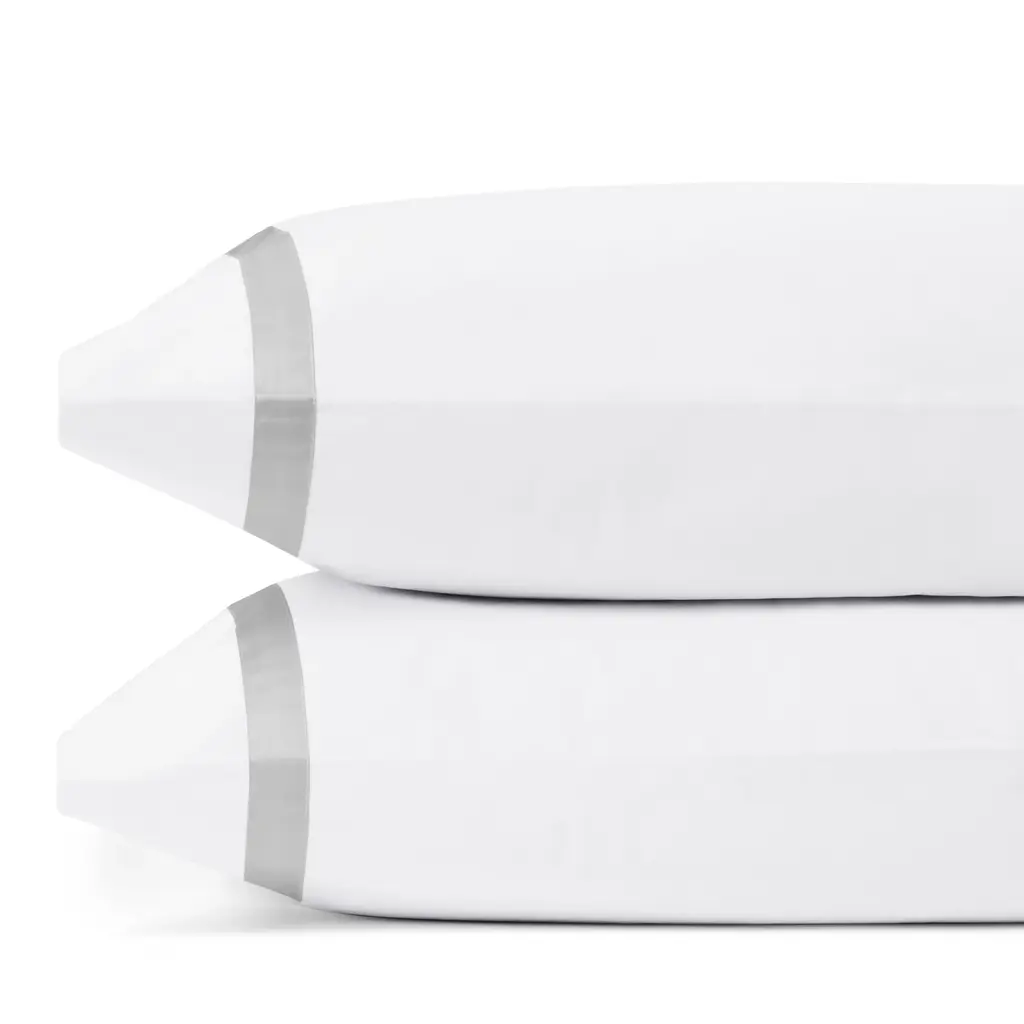 The understated sophistication of Estate's crisp white, Italian-woven long-staple cotton base is an immaculate backdrop for lustrous sateen appliqué detail, beautifully bordering these sheets to create a sense of tailored elegance.