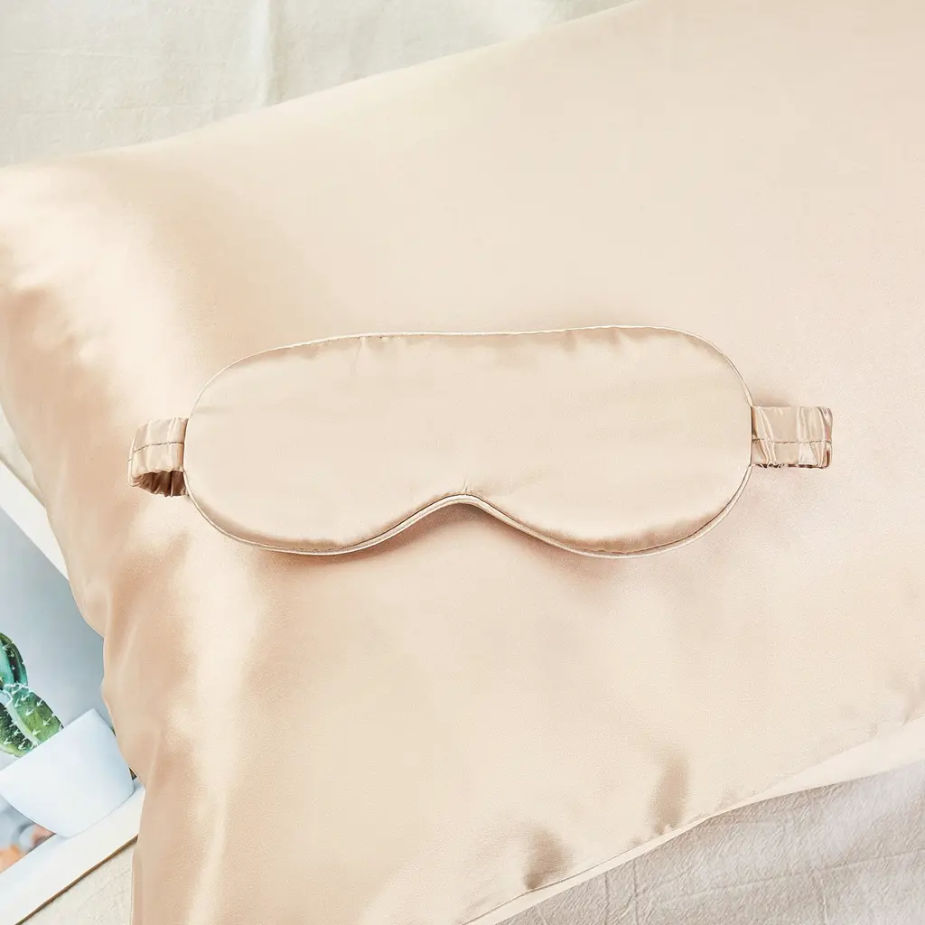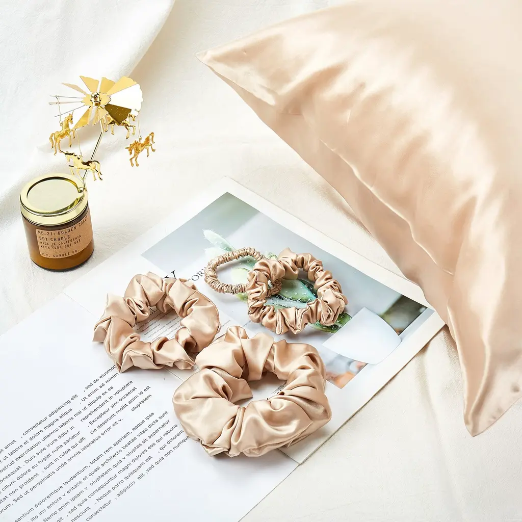 Gift Set: Beige Pure Mulberry Silk Pillowcase, Eye Mask And Scrunchies | Queen Size