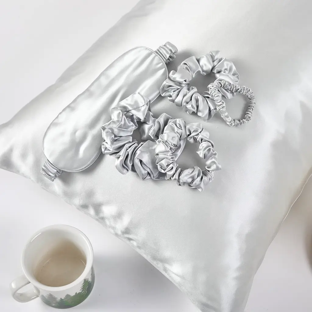 Gift Set: Silver Grey Pure Mulberry Silk Pillowcase, Eye Mask And Scrunchies | Queen Size