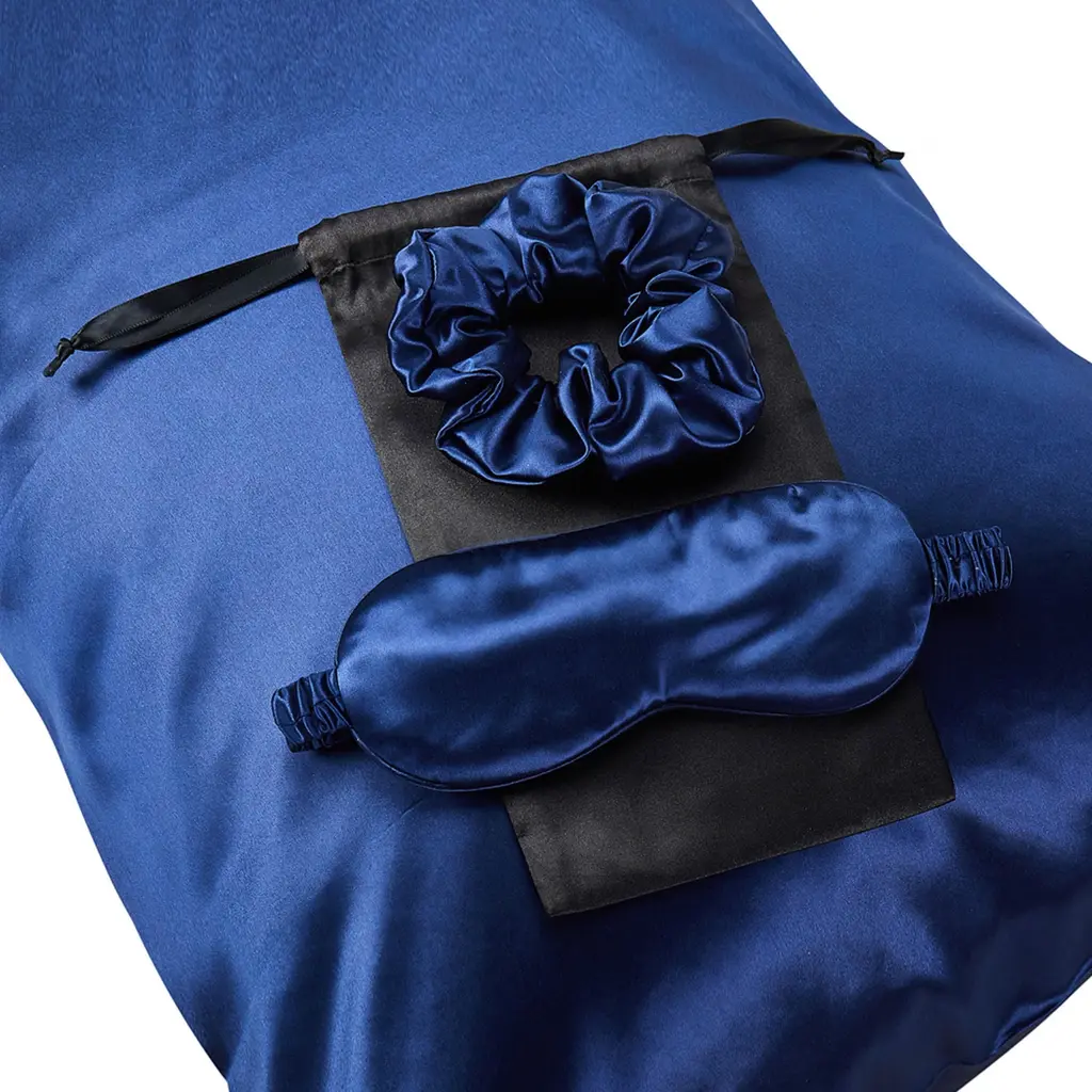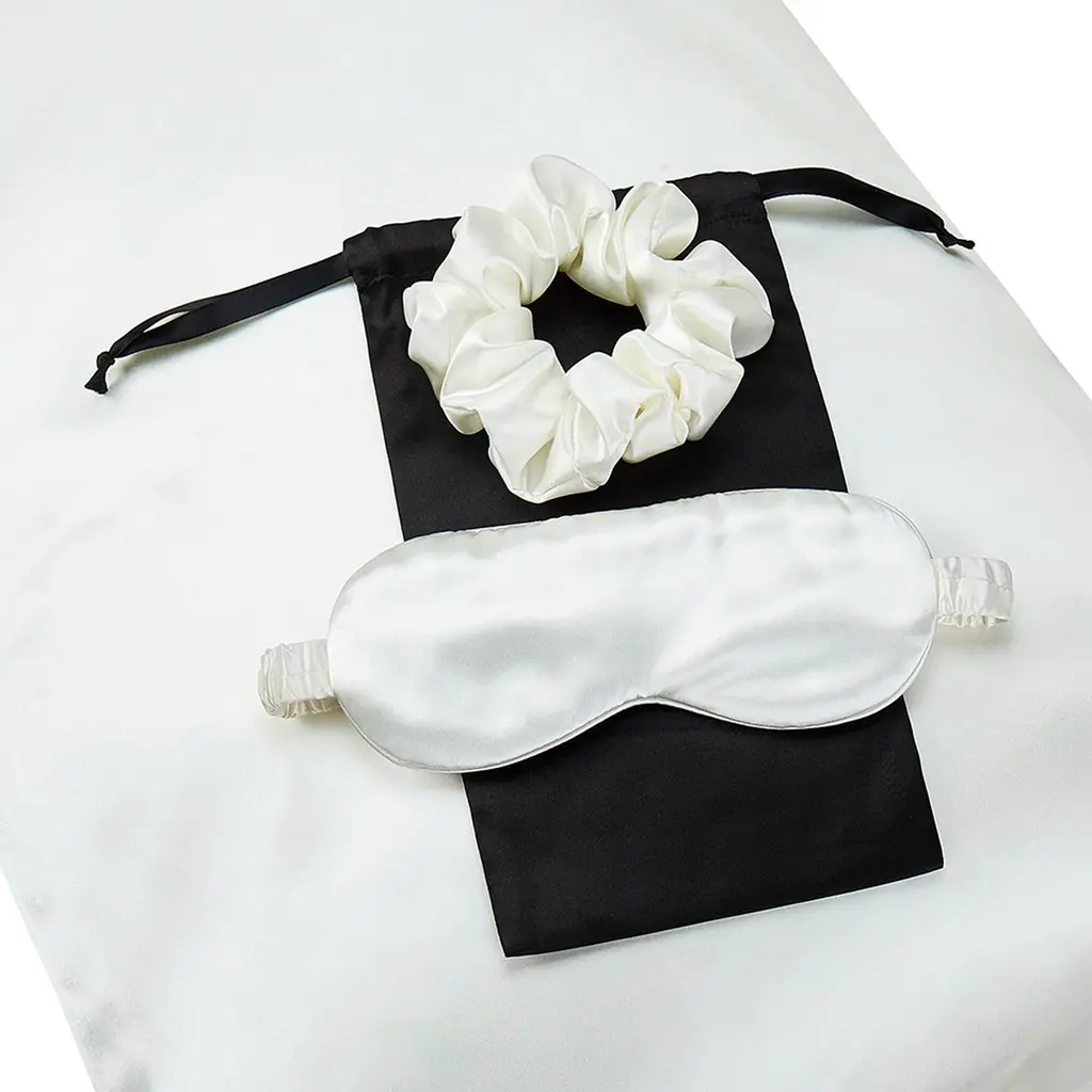 This is the gift set for someone whom you truly care about. With sumptuous silk, you are sending her the gift of hydrated hair, smooth skin, and night after night of peaceful sleep. Imagine her smile as she reaches back to tie her hair each morning.We strive to meet the best standards on the market, choosing quality tested, Grade 6A pure mulberry silk and plant-based dyes. Even our eye masks are filled with long strands of mulberry silk, softly stroking her eyes to a sweet slumber. Designed in Toronto.You will receive:One pillowcase One eye maskFour scrunchies: 0.4, 0.8, 1.4 and 2 inchesMaterial:100% long strand mulberry silk22 momme (600 thread count)Extra shiny silk charmeuseGrade 6a (highest grade)Non-toxic dyes