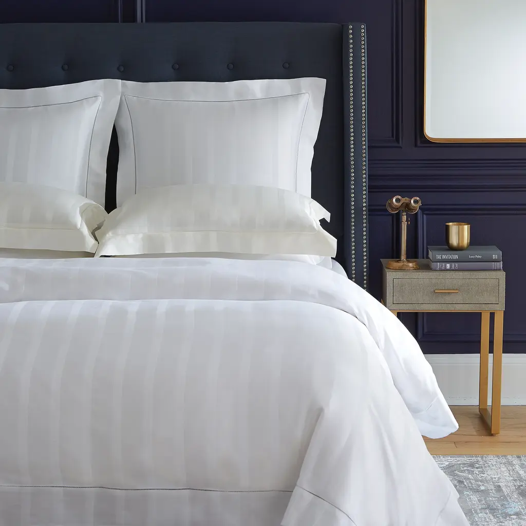 Of all the bedding SFERRA makes, Giza 45® may be the most impressive and most exclusive. Crafted from special yarns that are spun from a genus of Egyptian cotton commonly known as "The Queen of the Nile", Giza bedding is the ultimate of luxury linens. This prized cotton is spun and woven in Italy to an extraordinarily rich cloth, one so smooth and sleek and utterly soft, it could be mistaken for a silk. Here, the sateen jacquard is in a dobby stripe to create a bed of pure indulgence, perfectly tailored and finished with the hemstitched flanges.