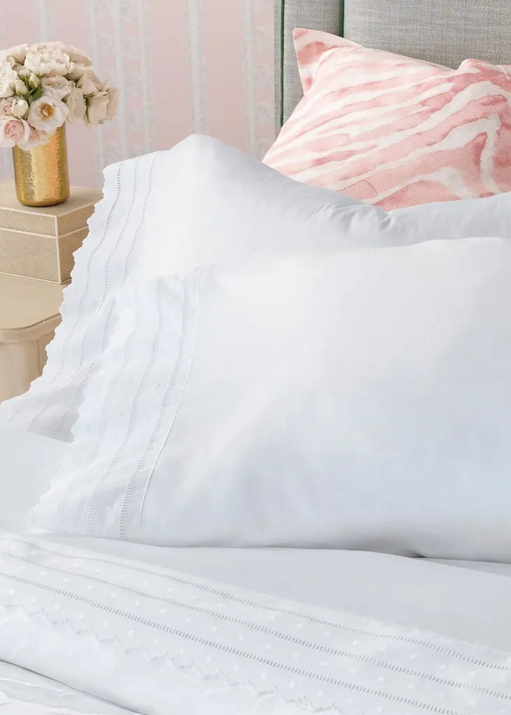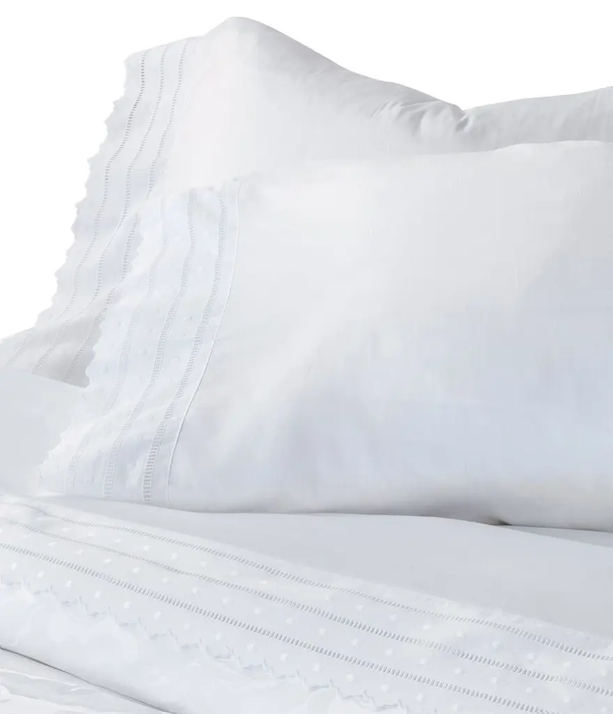 Woven in Italy of fine Egyptian cotton sateen, this silky-soft pillowcase is finished with a decorative lace border with hemstitching.