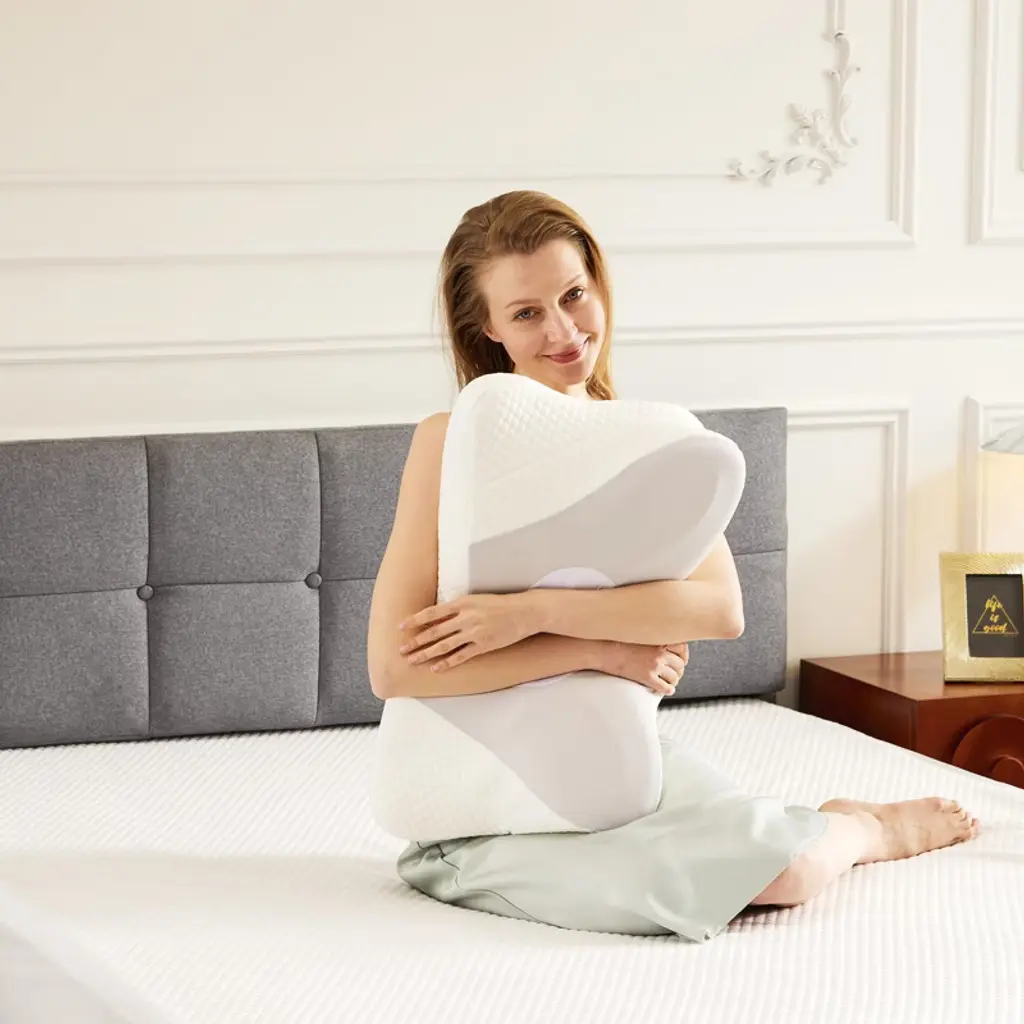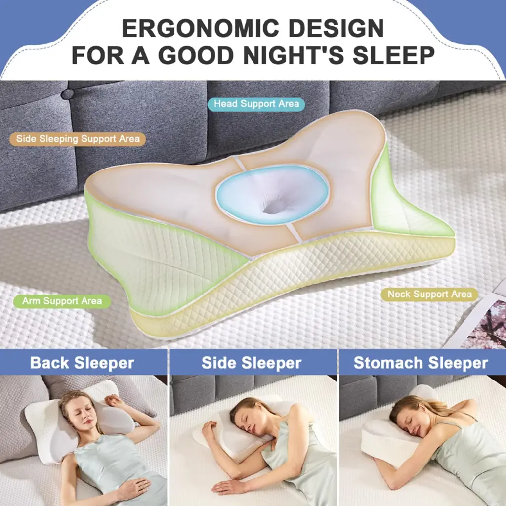 【Unique Design】Neck pillow airplane designed with a hollow center to maintain the natural curve of the neck and shoulders, providing effective support, stretch, and relaxation to the cervical spine.【Prime Materials】Ergonomic body pillow has Slow-Rebound Memory Foam Comfort molds to the contours of your head and neck, ensuring a personalized and comfortable sleeping experience.【Two Heights】The neck pillow provides two different heights to various body shapes and sleep habits. Let you feel a comfortable level of support and enjoy a peaceful sleep.【Zone Space】Butterfly-shaped Memory foam pillow with an armrest area provides additional support and comfort, enhancing your sleeping experience.【With Pillowcase】Side sleeper pillow with Breathable and removable cover makes it easy to wash, promoting heat dissipation and ensuring a clean and hygienic sleeping surface.