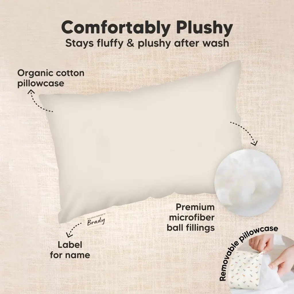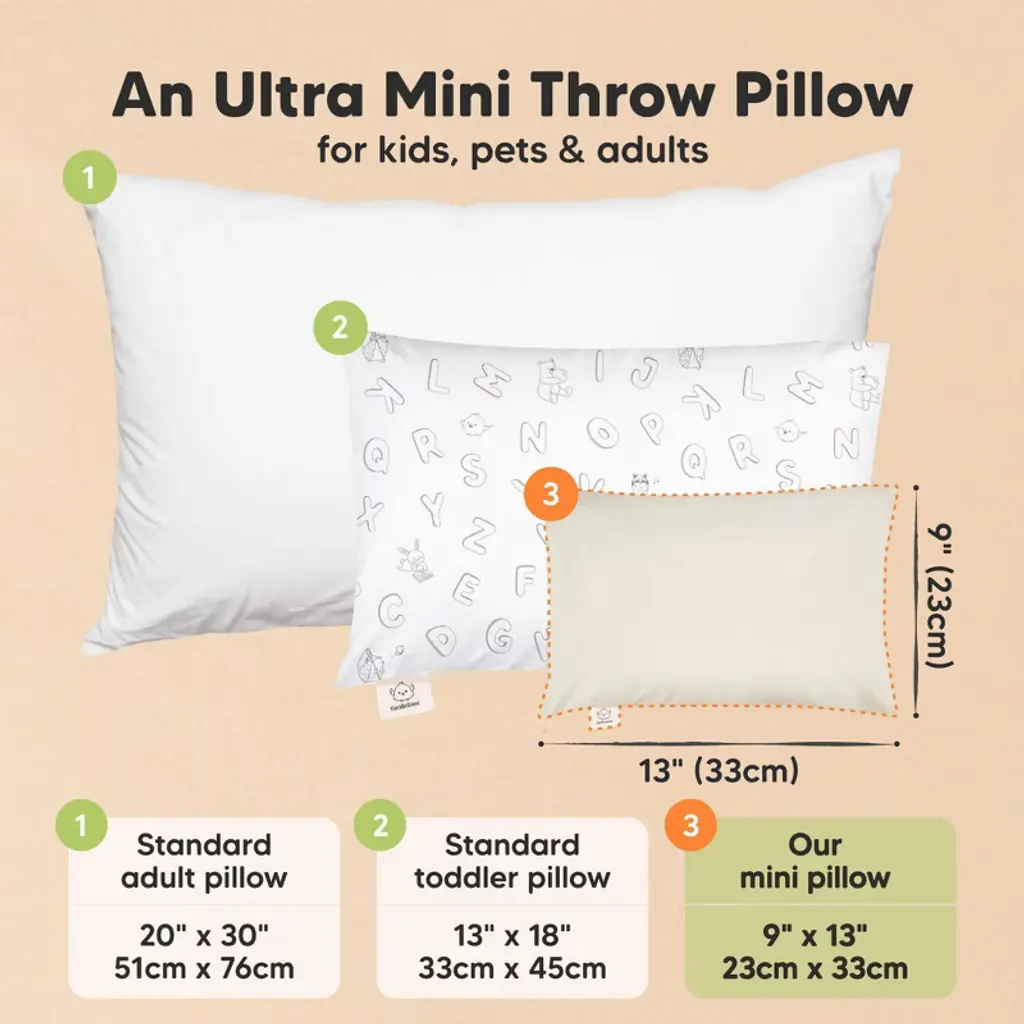 The KeaBabies My Little Dreamy Toddler Pillow Mini 9" by 13" , an ultra-small pillow for children that is made with breathable and safe OEKO-TEX 100 Standard certified cotton. Ergonomic designed to provide spinal support for toddlers aged 2 to 4 years old. This kids pillow is suitable for use during preschool naps, sleepovers, and travels. Machine-washable and dry-able for easy maintenance.