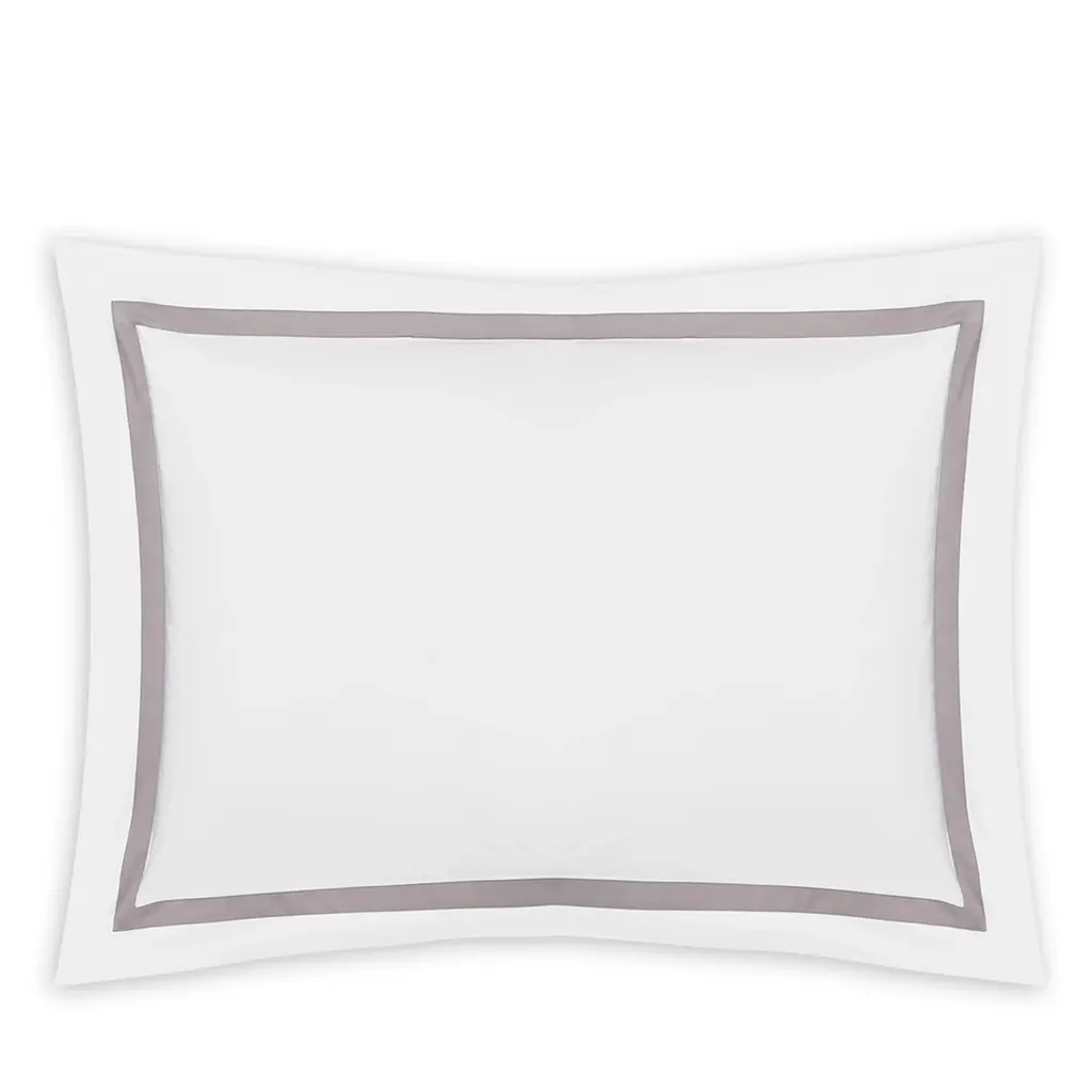 A classic bedding collection in crisp, white 600-thread count Egyptian cotton percale with a tape border in muted hues. A coordinating coverlet features an all over pearl matelasse design.