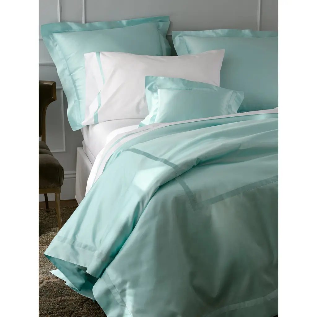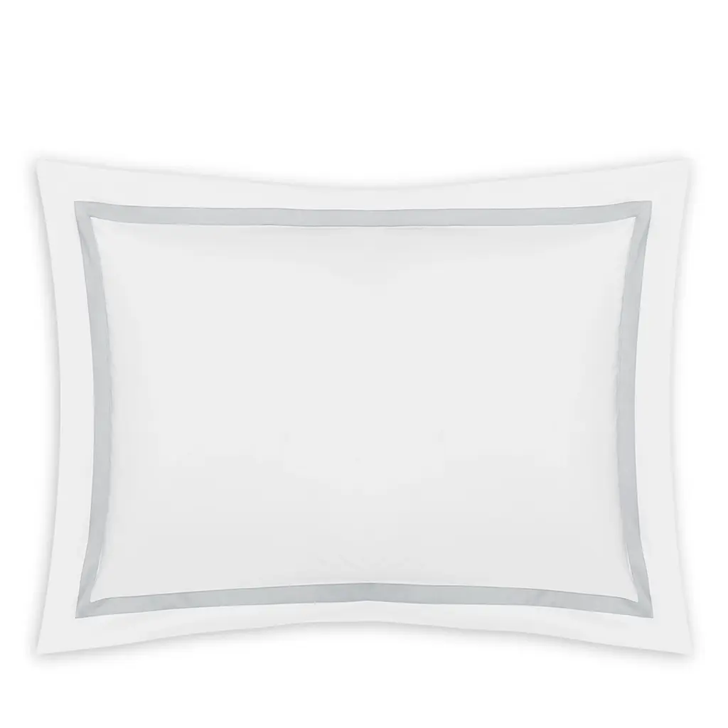 A classic bedding collection in crisp, white 600-thread count Egyptian cotton percale with a tape border in muted hues. A coordinating coverlet features an all over pearl matelasse design.