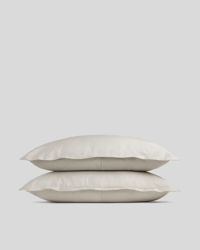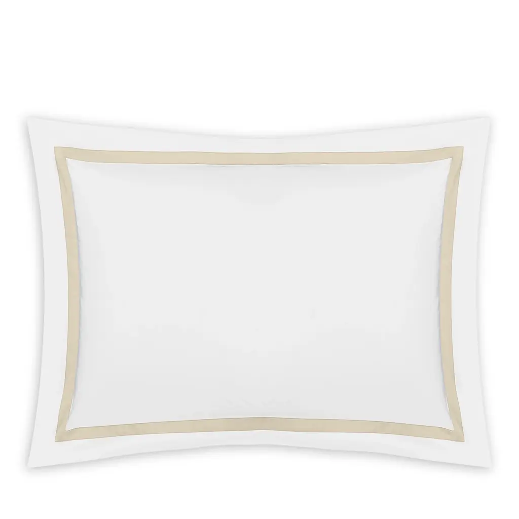 A classic bedding collection in crisp, white 600-thread count Egyptian cotton percale with a tape border in muted hues. A coordinating coverlet features an all over pearl matelasse design.