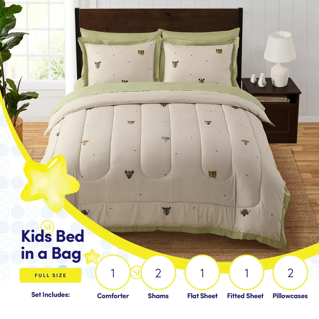 This bedding collection includes 1 comforter and 2 pillowcases — perfect for upgrading your child’s bed (note: pillows and sheets are not included). Boasting vibrant, double-sided prints in eye-catching colors, the set instantly captures kids’ attention, adding a playful touch to their bedroom. Crafted from soft microfiber polyester, it ensures year-round comfort, keeping little ones cozy through every season for a restful night’s sleep. Practical too: the fabric is fade-resistant, maintaining its bright hues wash after wash. For easy care, machine wash cold and air/tumble dry on low. A blend of style, softness, and durability, it’s designed to delight kids and simplify parents’ routines.