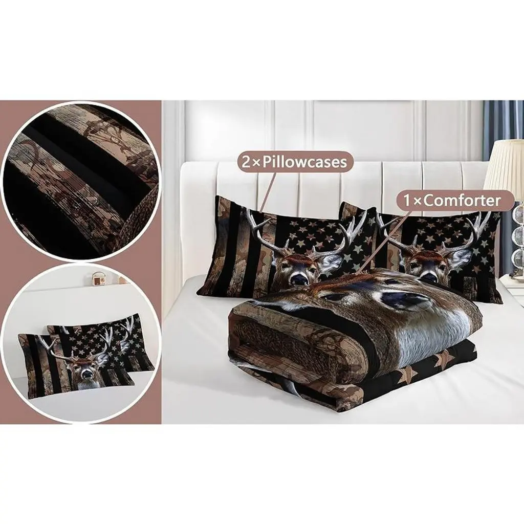 Luupatchy 3Pcs Deer Hunting Camo Comforter Set, With 1 Comforter And 2 Pillowcases For Boys And Girls Bedroom All Season,queen