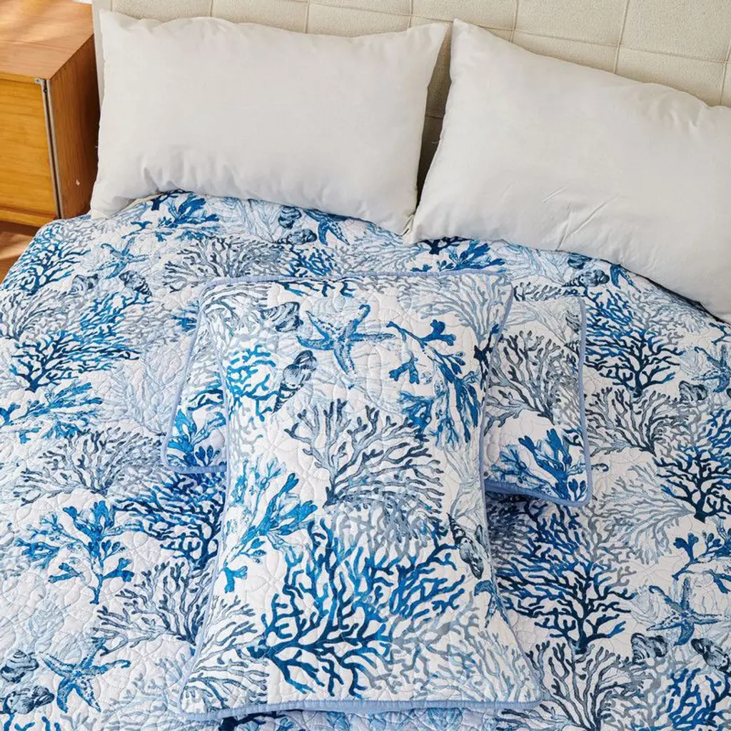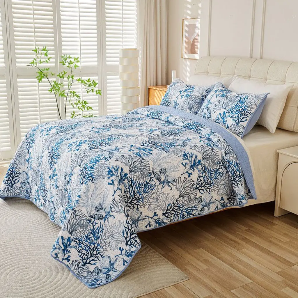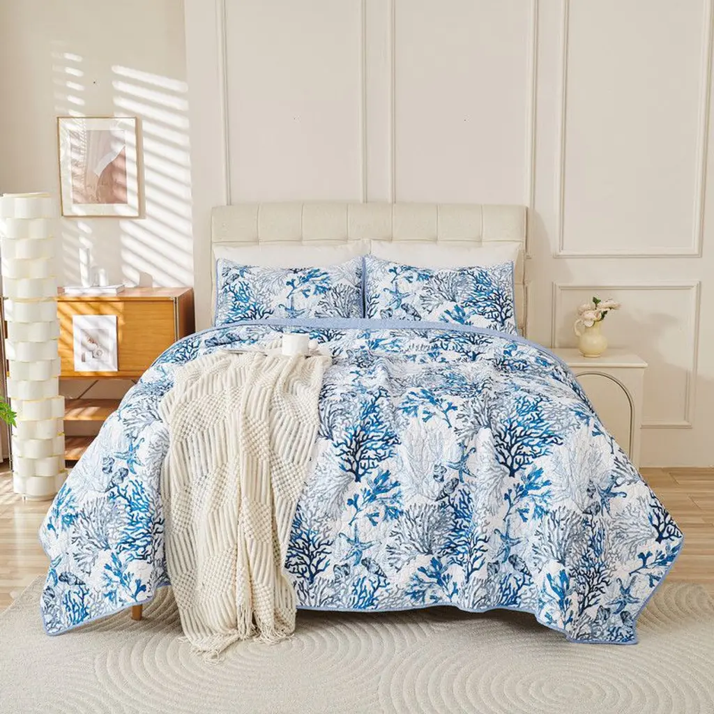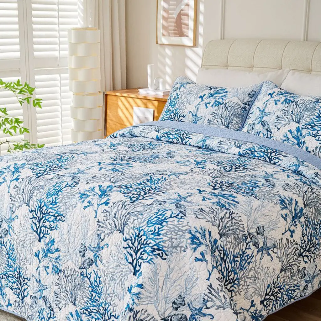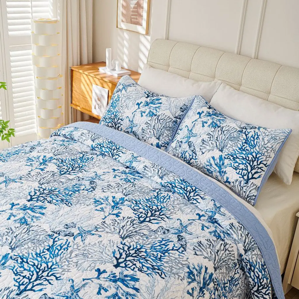 Luupatchy Blue Coral Print 3 Pc Quilt Set is perfect for beach lovers wanting relaxed, practical bedroom style—made of quick-dry polyester, it’s moisture-wicking, sand-resistant, and breathable, keeping you cool in humid weather and cozy in mild seasons, while its blue coral pattern brings coastal calm seamlessly; the set includes 1 quilt (3 sizes: Twin: 68in W×86in L for 39in W×75in L beachside Twin beds, Queen: 92in W×96in L for 60in W×80in L humid-climate Queen beds, King: 106in W×96in L for 76in W×80in L King beds) and 2 pillow cases (20in W×26in L with soft edges, fitting standard sleeping pillows), plus it’s machine washable and dries fast, resisting salt damage and fading, providing a complete, hassle-free coastal bedding pick without extra buys.