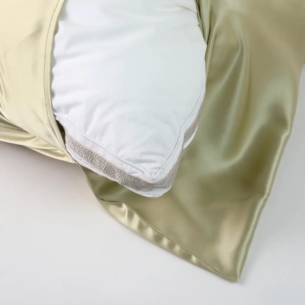 A delicious, opulent collection, made to impress those who love silk.We've sourced 100% mulberry silk 30 momme and above for this collection. A 22 momme silk is already considered luxurious by industry standards. However, 32 momme is a different story. The feel is soft, dense, and buttery. When you hold it in your hands, you will be surprised to feel the weight of a single pillowcase. It will drape down fluidly from your hand, like a flowy evening dress.Designed in Toronto.Material100% natural mulberry silk32 momme silk charmeuse Grade 6A (highest grade)Non-toxic dyes