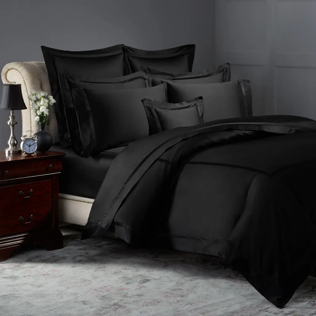 Crafted from fine Egyptian cotton, Matouk's Nocturne sheets complete an opulent or traditional space, with its classic colors and luminous sheen, accented with a tonal ribbon border.