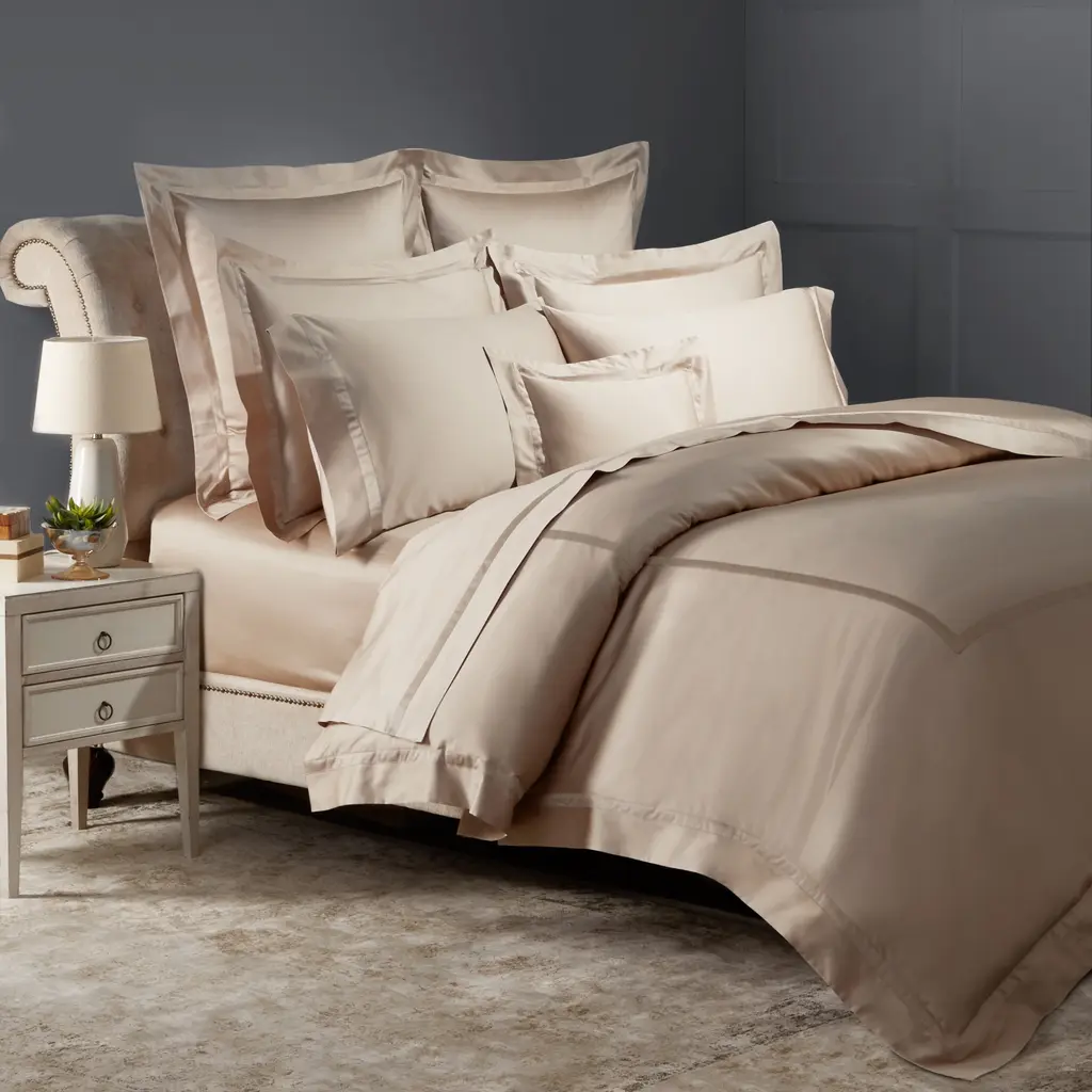Crafted from fine Egyptian cotton, Matouk's Nocturne sheets complete an opulent or traditional space, with its classic colors and luminous sheen, accented with a tonal ribbon border.