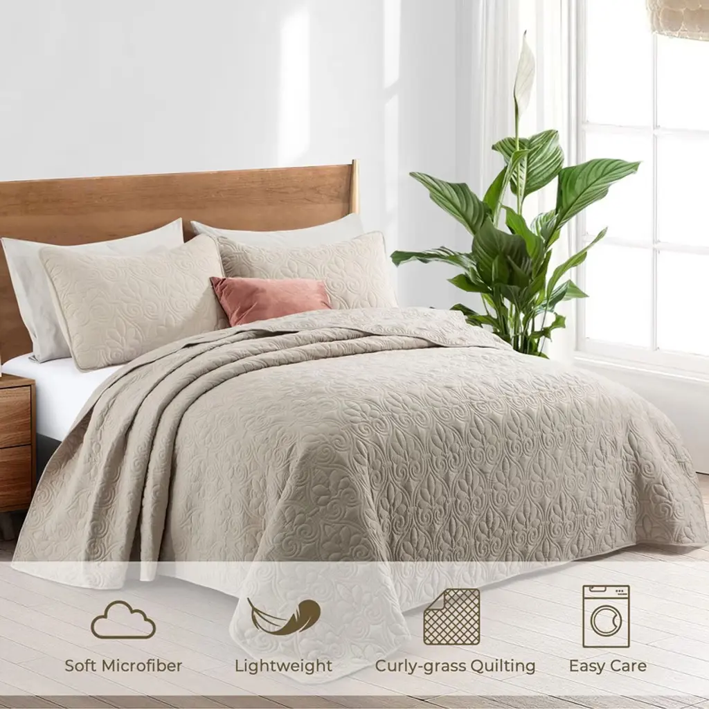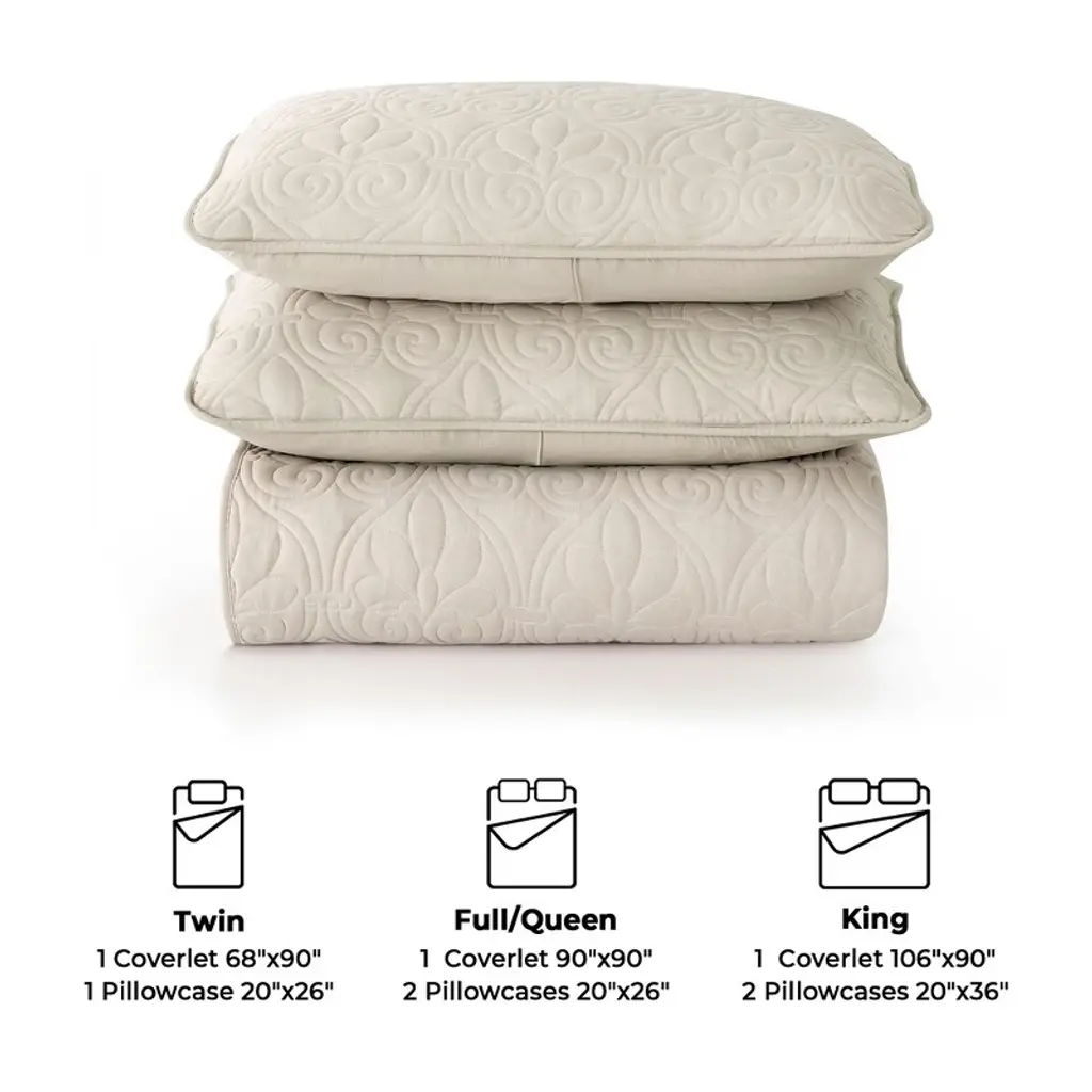 Our Quilted Microfiber Coverlet Set, the perfect addition to your bedding collection. This 3-piece set is made from high-quality microfiber that has been pre-washed for added softness and comfort. The set includes a coverlet and matching pillowcases, all in a stylish khaki color that complements any bedroom decor. The Twin set comes with one pillowcase, while the Full/Queen and King sets have two pillowcases. The pillowcases feature a 4" envelope closure for a neat and tidy look.