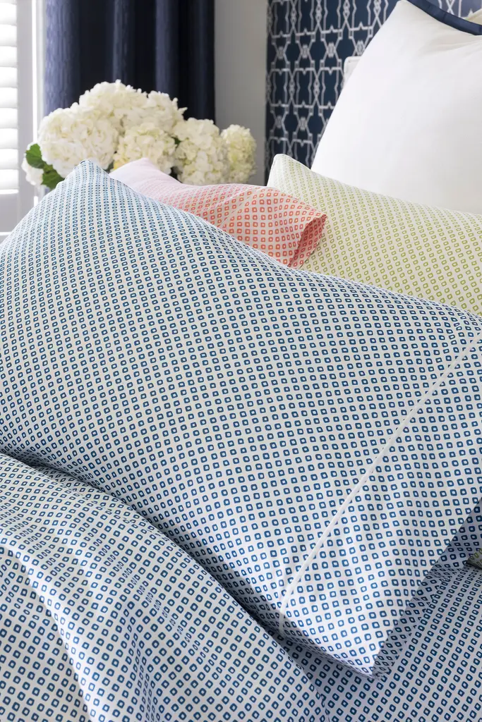 Bring a little color to your bedding with our geometric, dotted Emma pattern masterfully printed on sateen pillow cases. It’s a fun print you’re sure to love! Pillow Cases are packaged, 2 Cases/Pack Mary Ella Gabler founded Peacock Alley 45 years ago with a passion for creating beautiful textiles. She has built one of the first woman-owned, woman-operated multi-million dollar bedding brands in America. Peacock Alley is known for bedding and bath linens that are crafted with pride and precision to stand up to real life, and get even better with time. 100% Cotton Sateen Machine wash cold; tumble dry low Imported * Dimensions * Standard: 20"x 30" King: 20"x 40" Looking for the sweetest of dreams? Read our guide to find the perfect bedding for you, and learn how to care for it season after season.