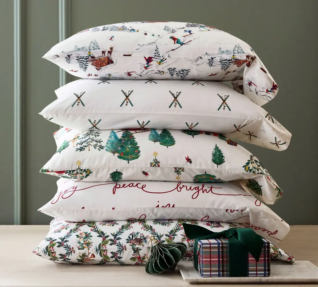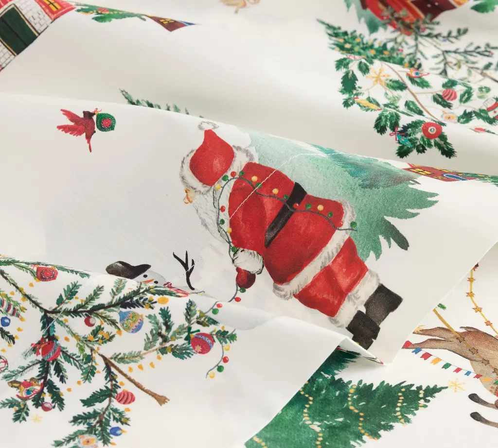 This enchanting design, which looks like a watercolor rendering, brings the magic of the season indoors. Cozy cabins and Santa's sleigh add a pop of red to the canvas, while evergreen trees and colorful baubles give it a festive finish.