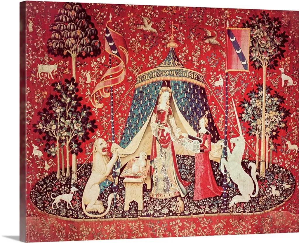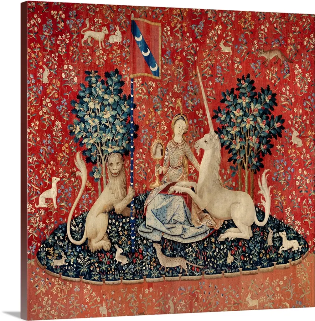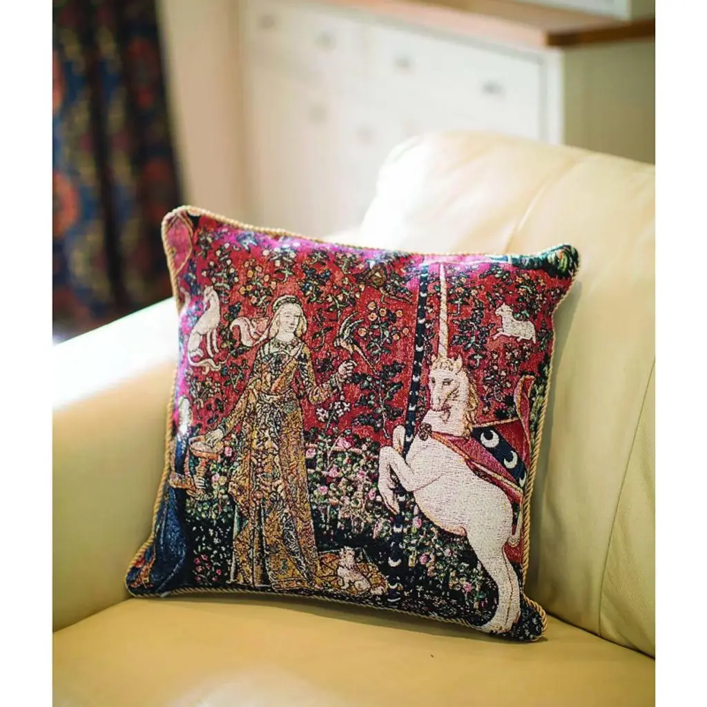 From our collectable series of red pillowcases or cushion covers based on the Lady and the Unicorn tapestries, this Mediaeval cushion design illustrates the sense of taste. In the image, the lady takes sweets from a dish while a parakeet perches on her hand, and the unicorn stands next to her. Decorate a bed, sofa or couch to turn any part of your home into a unicorn themed room. Order your art pillows now! PRODUCT DESCRIPTION: A decorative pillowcase that is sure to liven up any room in the house This modern, tapestry cushion design makes the perfect scatter cushion for a modern finish and is a welcome addition in any homePillow covers 18x18 inchesThe unique cushion covers have a double-sided tapestry cushion with a piped edgeConcealed zip on one end to allow pad to be removed for washing or replacementThe drawing is represented on both sidesSize: 17.7 x 17.7 x 0.4 inches - Weight: 0.4 lb