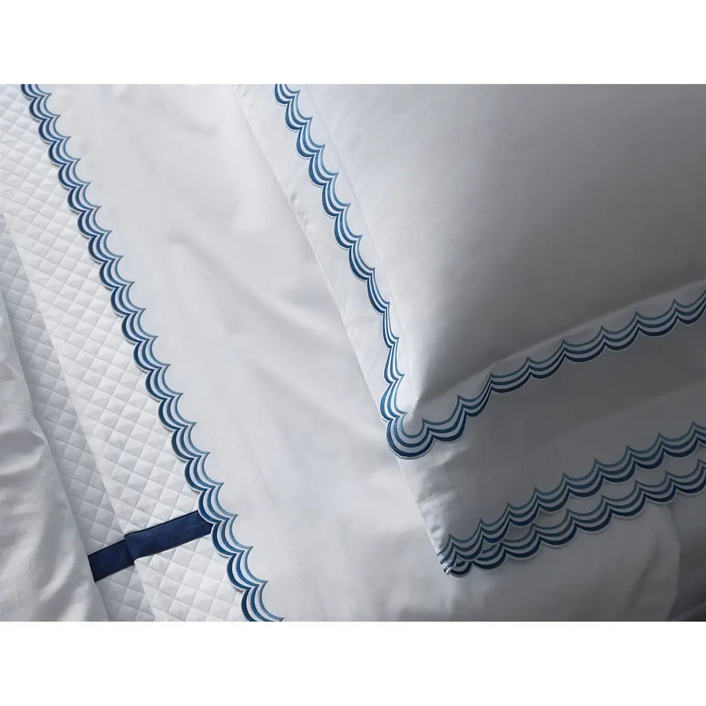 Stella from Matouk is a stylish embroidered collection featuring three lines in tonal hues curved across the flange of crisp Milano percale sheeting. It has an Art-Deco feel that's artistically inspired, and its range of color combinations is designed to delight the senses.