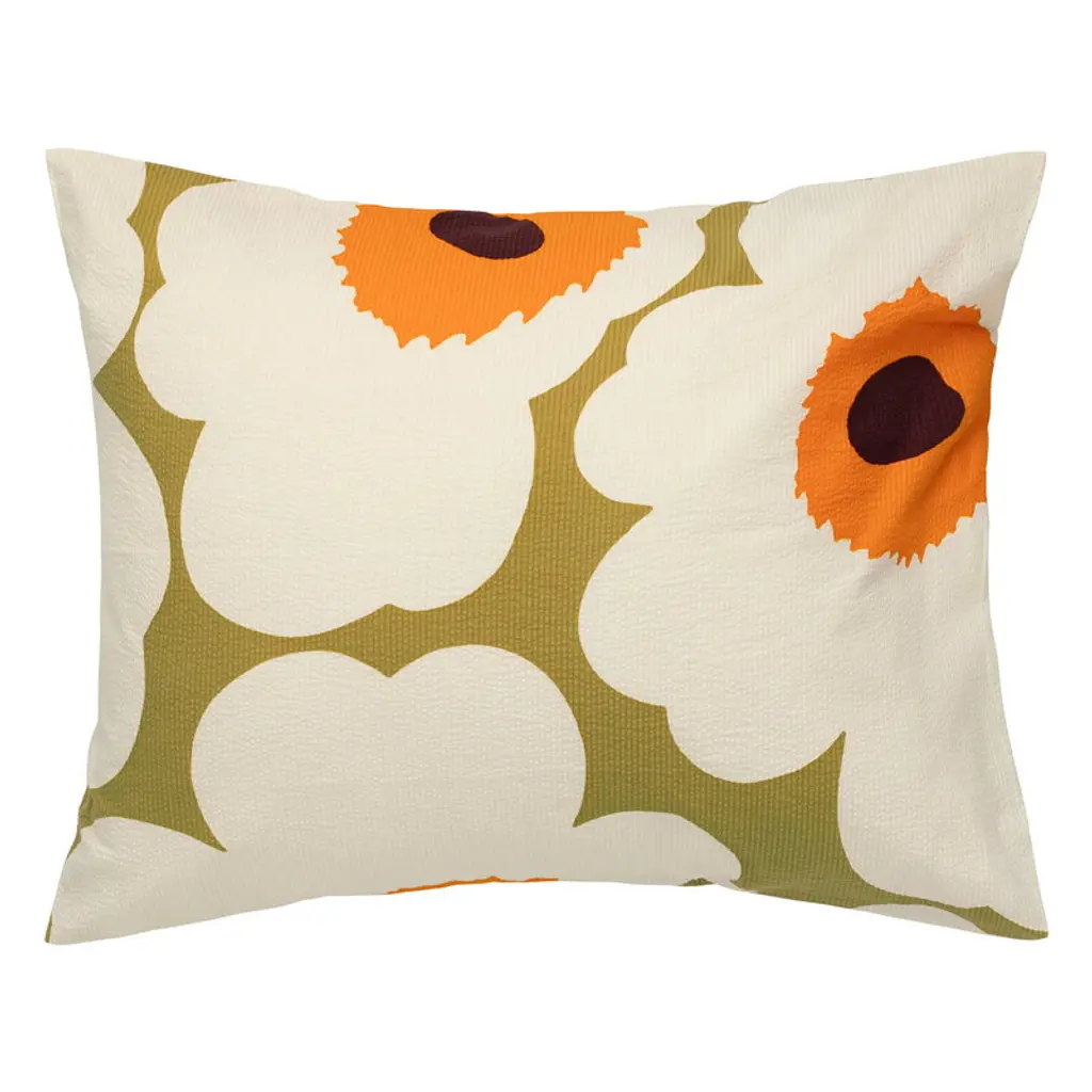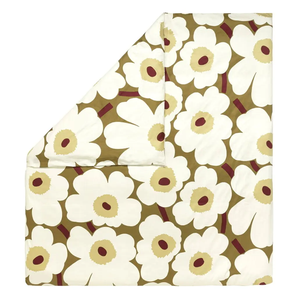 Marimekko's Unikko sateen pillowcase features Maija Isola's iconic floral pattern in green and beige hues. Made from luxuriously smooth organic cotton sateen, this pillowcase measures 19.69 in (50 cm) x 23.62 x 0 in (60 x cm. cm). Complete your bedroom look with a matching Unikko duvet cover or mix and match with different Marimekko patterns! All fans of Finnish design surely recognize Unikko, but have you ever heard the story behind the pattern? Maija Isola created it in 1964 after Armi Ratia, the founder of Marimekko, had publicly announced that no floral fabrics would be printed at the design house. Isola did not accept these rules and restrictions without a fight and, in protest, ended up designing an entire collection of bold floral patterns. One of these designs was Unikko, which quickly became a favorite of Ratia, too. Today, Unikko is one of Marimekko's best-known and most beloved patterns worldwide.