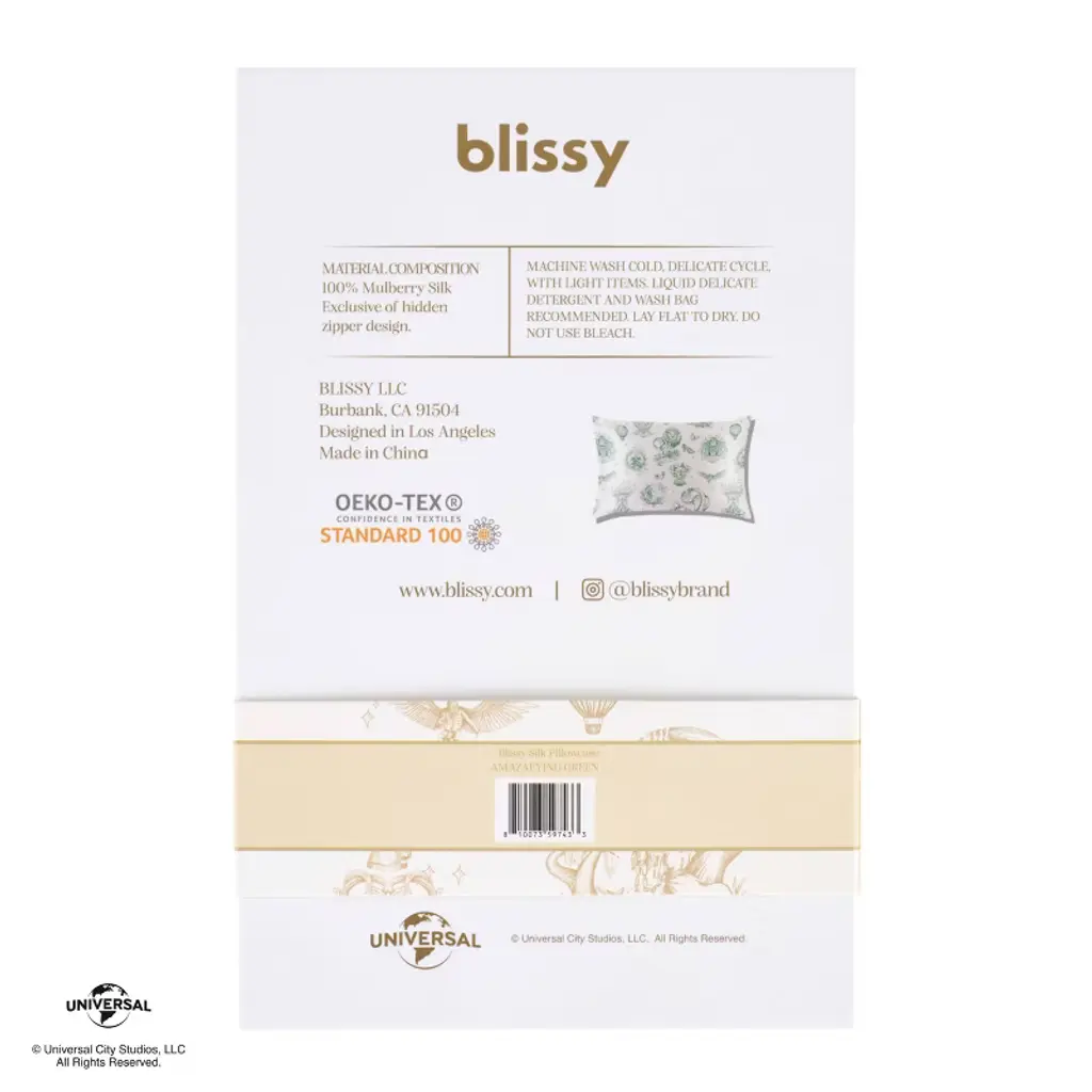 The luxury of silk meets the magic of Wicked! Bring a little piece of Oz home with this enchanting collection.Woven from 100% pure mulberry silk, the Blissy Pillowcase is designed to offer you the perfect sleep experience. With Blissy, you wake up feeling refreshed with gorgeous, frizz-free hair and even-toned skin. Blissy’s low-absorbent silk ensures your hair and skincare products remain where they should—on your hair and skin, not absorbed by the pillowcase. The Blissy Pillowcase is hypoallergenic and temperature-regulating, letting you enjoy rejuvenating sleep tailored for your comfort. Unlike synthetic satin, Blissy uses pure silk free from harsh dyes and chemicals. You'll get a cool, breathable night’s sleep while enjoying cloud-like softness. Comes in standard size.