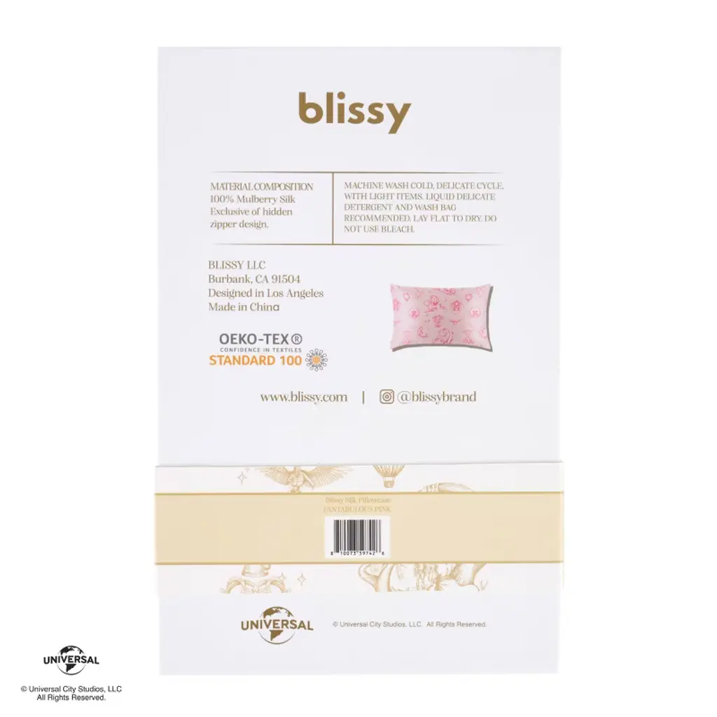 The luxury of silk meets the magic of Wicked! Bring a little piece of Oz home with this enchanting collection.Woven from 100% pure mulberry silk, the Blissy Pillowcase is designed to offer you the perfect sleep experience. With Blissy, you wake up feeling refreshed with gorgeous, frizz-free hair and even-toned skin. Blissy’s low-absorbent silk ensures your hair and skincare products remain where they should—on your hair and skin, not absorbed by the pillowcase. The Blissy Pillowcase is hypoallergenic and temperature-regulating, letting you enjoy rejuvenating sleep tailored for your comfort. Unlike synthetic satin, Blissy uses pure silk free from harsh dyes and chemicals. You'll get a cool, breathable night’s sleep while enjoying cloud-like softness. Comes in standard size.