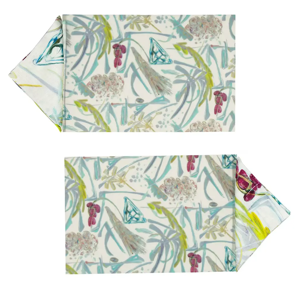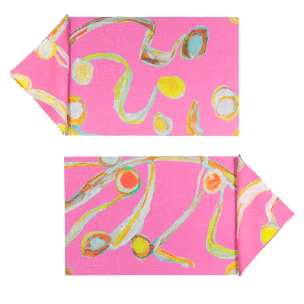 A vivid pink tone distinguishes this splendid set of two rectangular placemats with matching linen napkins, fashioned of polyester-coated linen for easy and practical maintenance. Boasting an original Luisa Longo painting digitally printed on the pink surface, it will style a contemporary dining table with singular charm. Washable with water and soap.