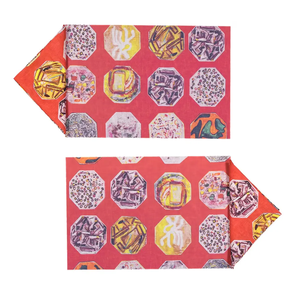 This original Luisa Longo hand-painted artwork has been digitally printed on linen, each piece is cut from a very large motif so all the mats will be different from each other, forming a unique table setting. The fabric has been embedded in an exclusive polyurethane solution with the softest peach skin feel. The placemats have an extraordinary resistance to heat, abrasions, and stains, light and totally flexible, can be washed just with a drop of water and soap.