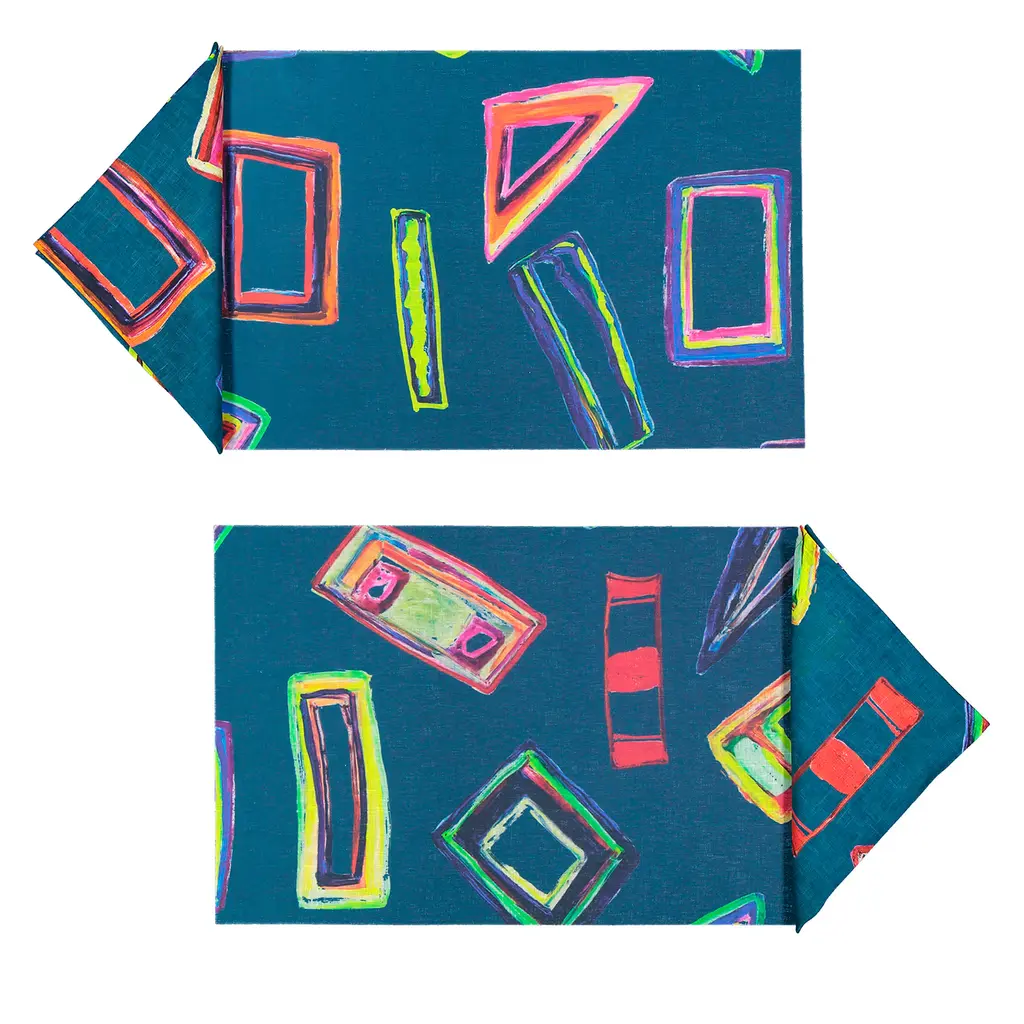 This original Luisa Longo hand-painted artwork has been digitally printed on linen, each piece is cut from a very large motif so all the mats will be different from each other, forming a unique table setting. The fabric has been embedded in an exclusive polyurethane solution with the softest peach skin feel. The placemats have an extraordinary resistance to heat, abrasions, and stains, light and totally flexible, can be washed just with a drop of water and soap.