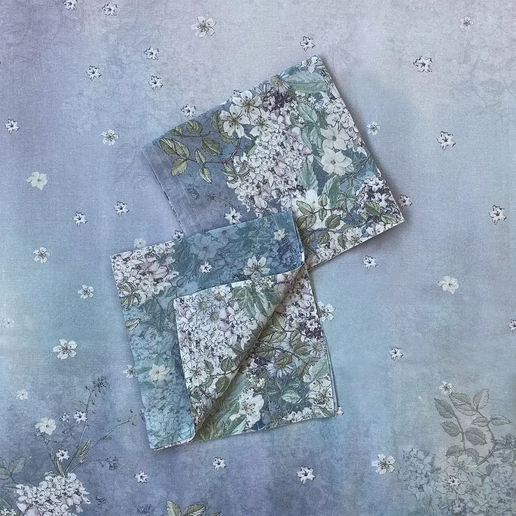 A romantic pattern of delicate white flowers on a light blue background graces this set of 6 placemats with matching napkins. Woven from high-quality linen, this exclusive set makes for a refined presence on the table with its subtle design, whose natural feel will complement and enhance a wide range of tableware, from traditional to contemporary.
