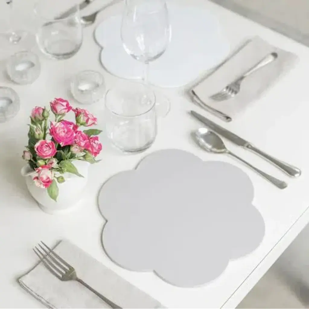 This set of 4 Chiffon Scalloped Placemats is finished with 20 coats of high gloss lacquer, hand polished between each coat. They will beautifully complement any dining room or kitchen.
